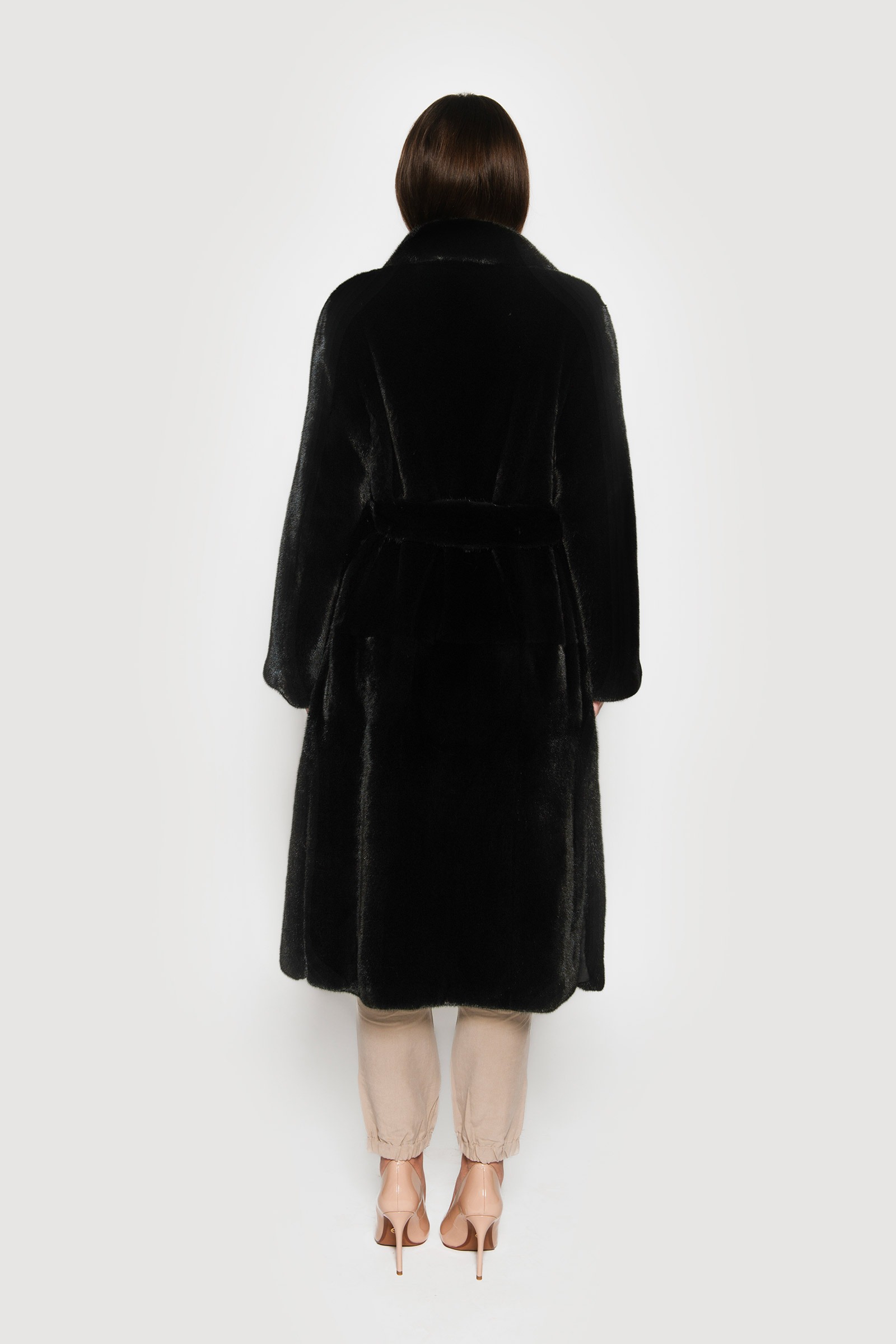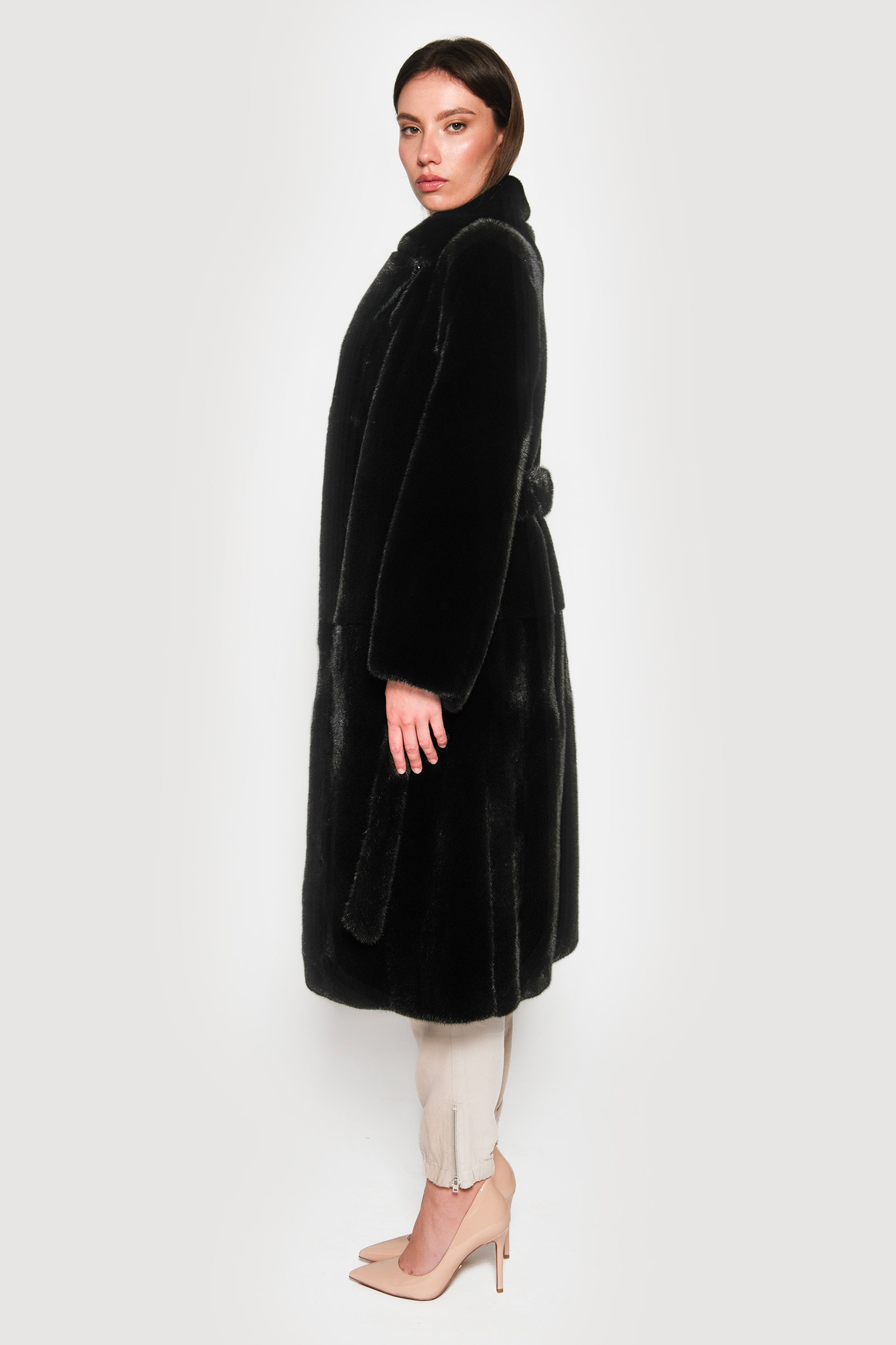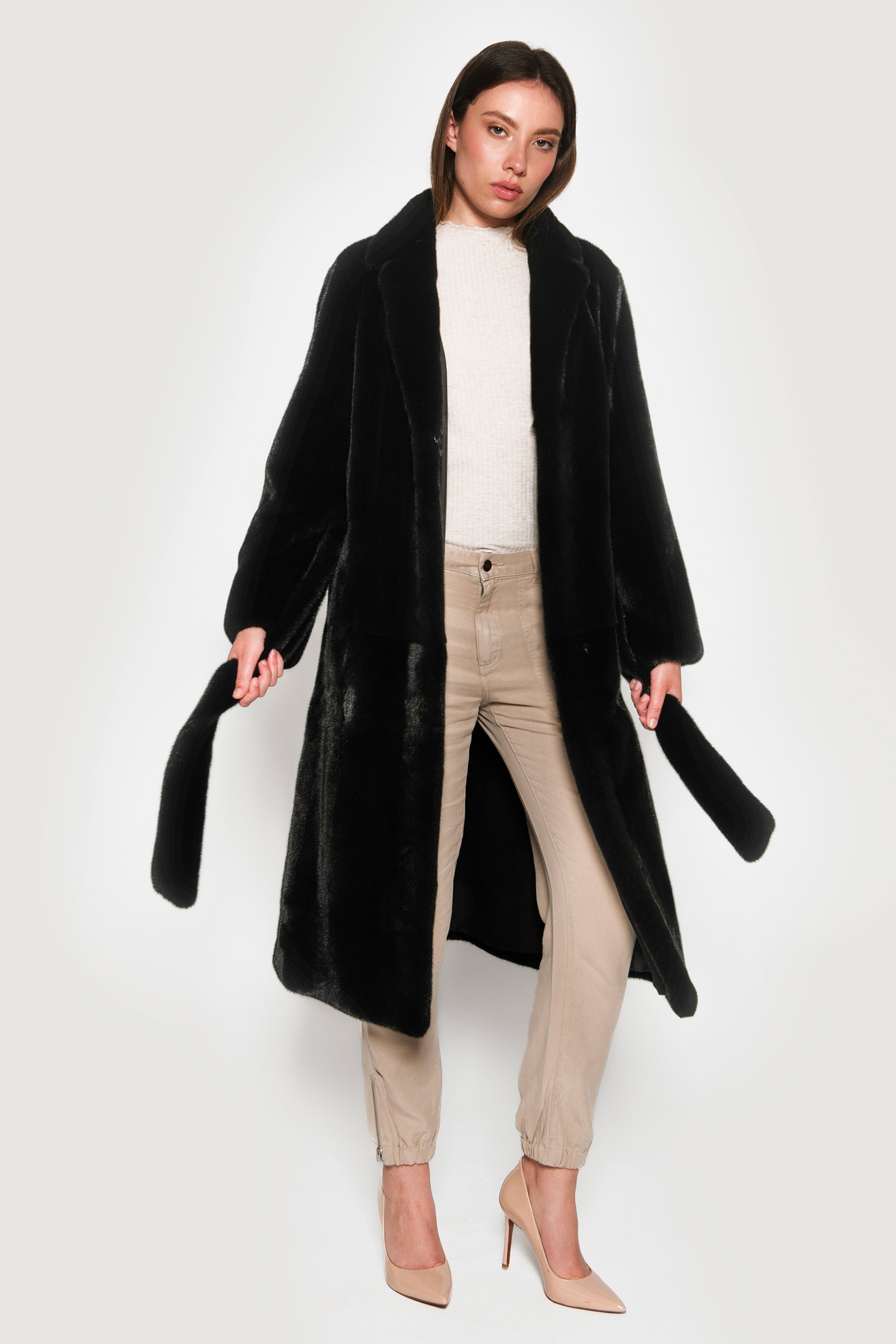 Long mink jacket with vertical processing, mink belt closure and buttons, lapel collar, silk lining
