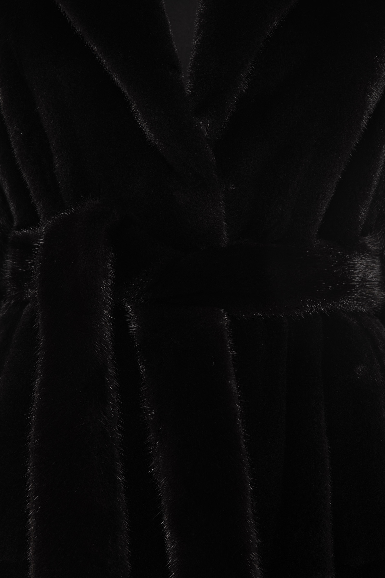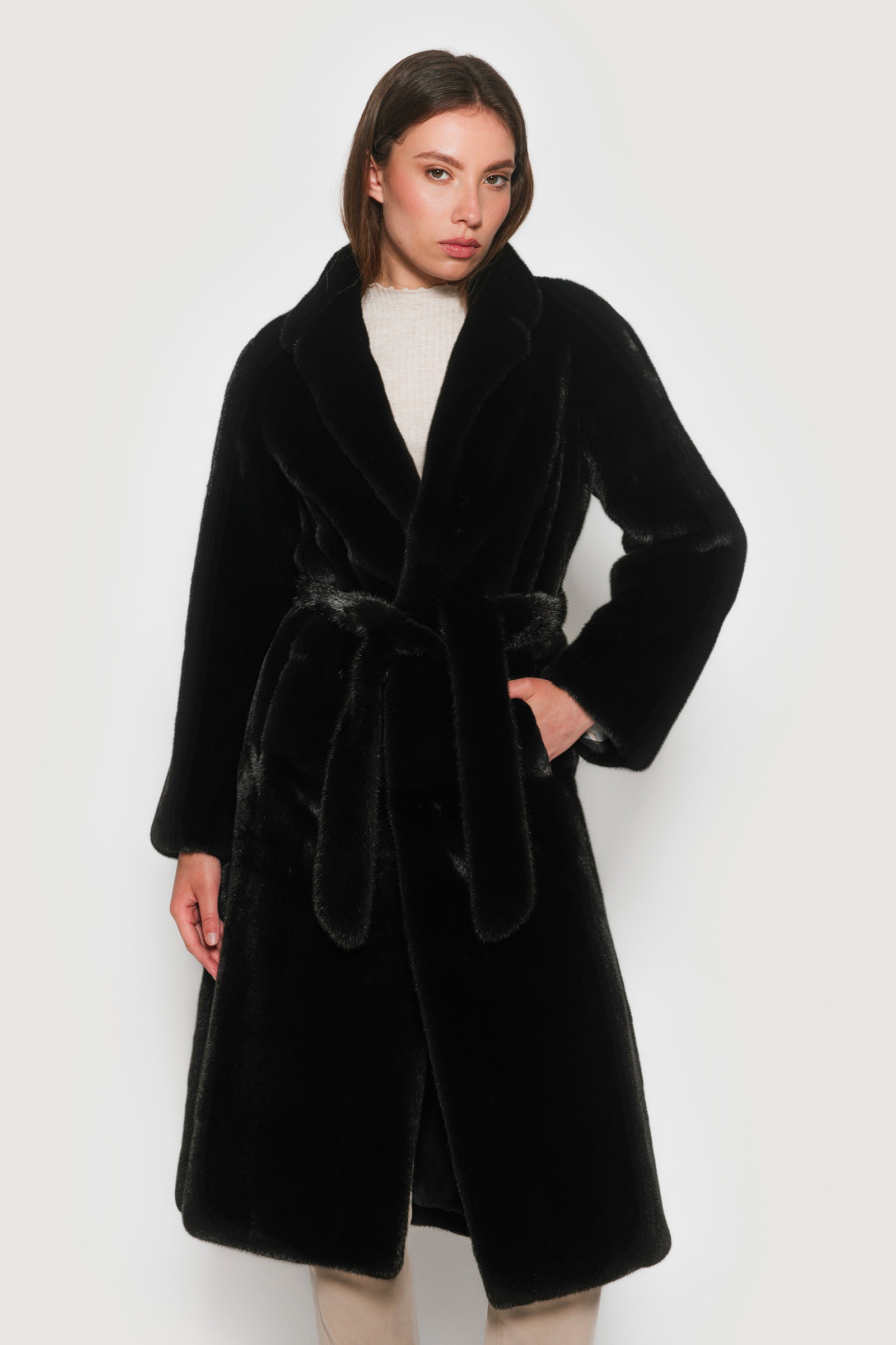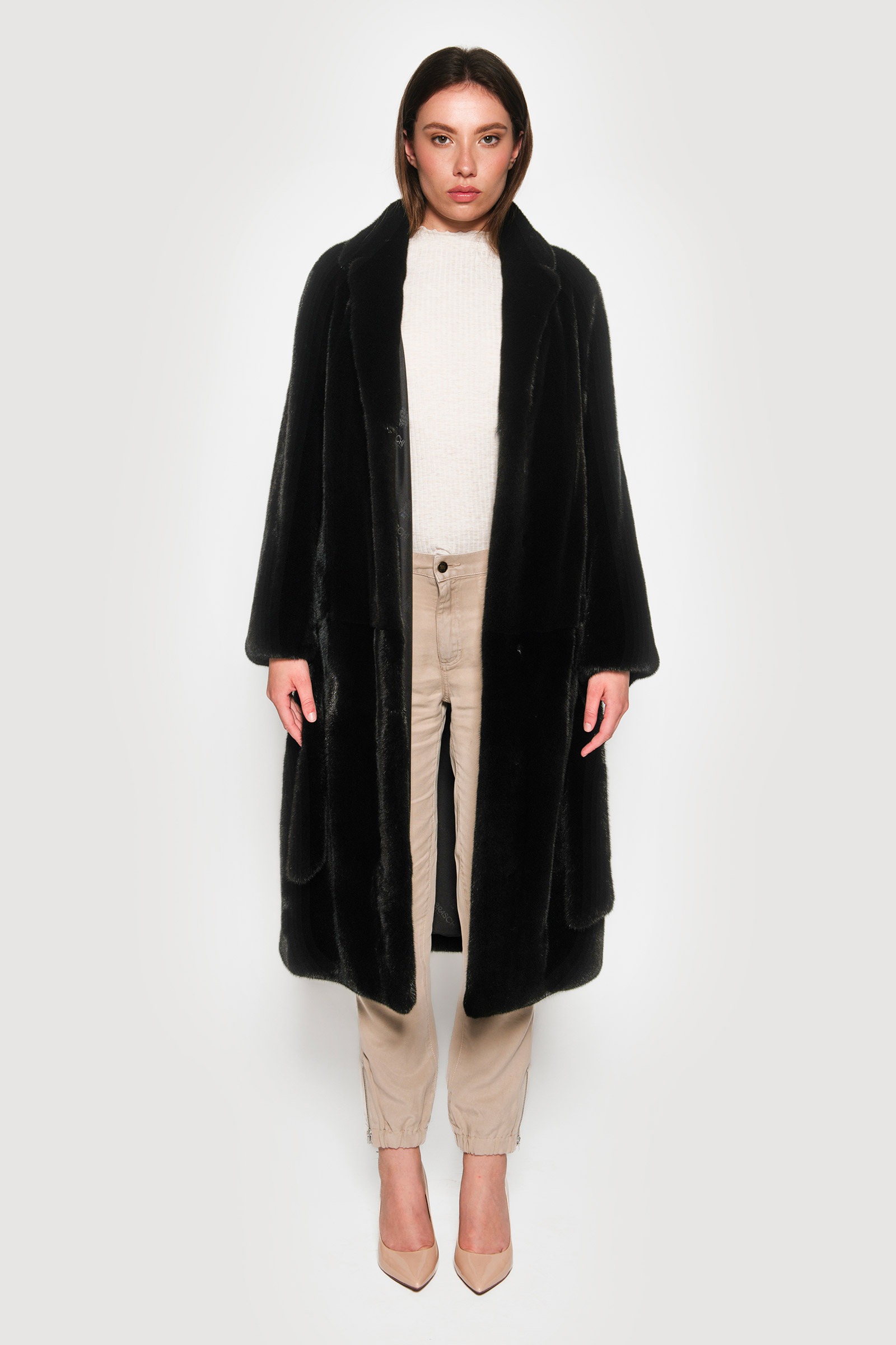 Long mink jacket with vertical processing, mink belt closure and buttons, lapel collar, silk lining