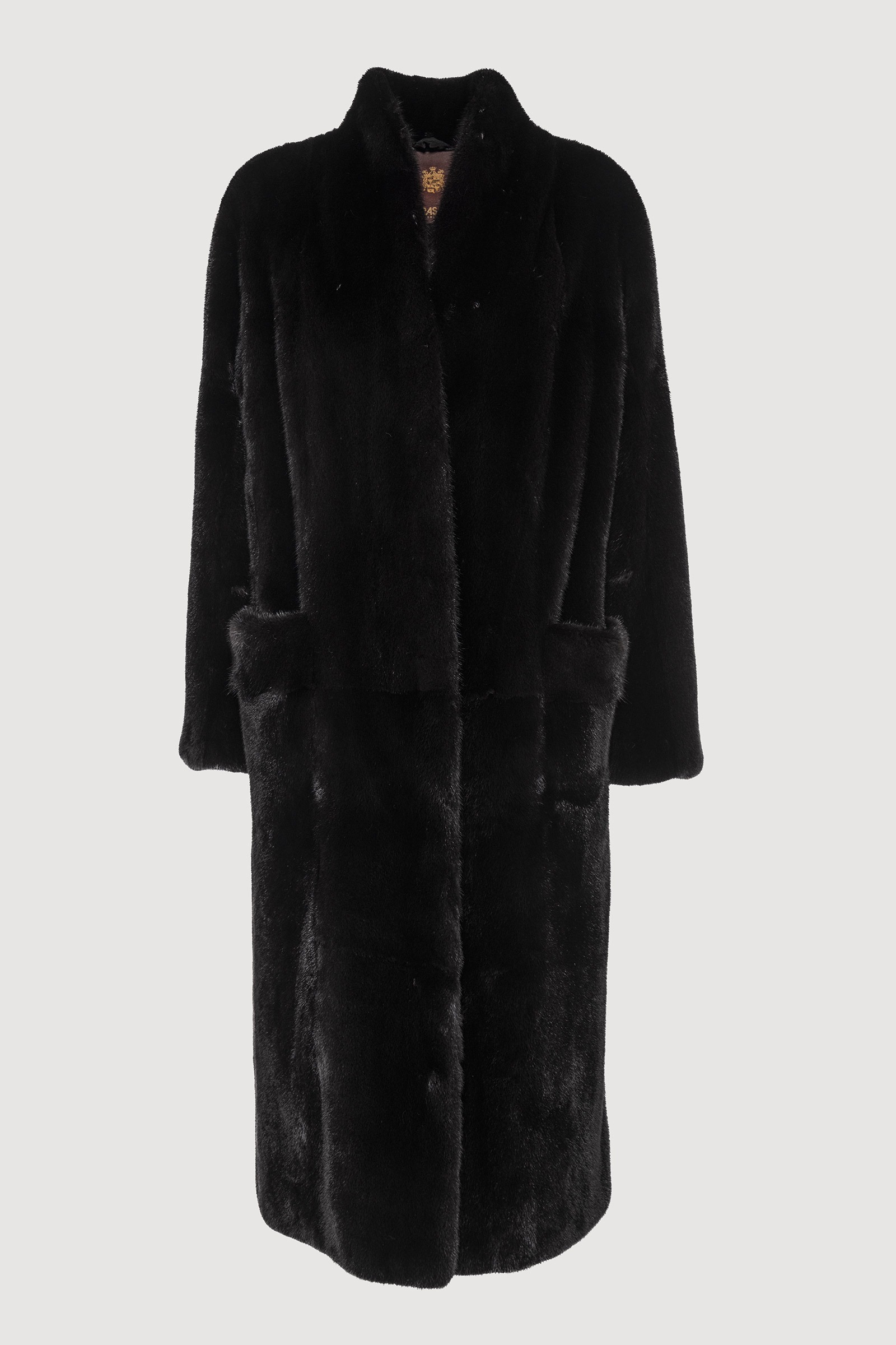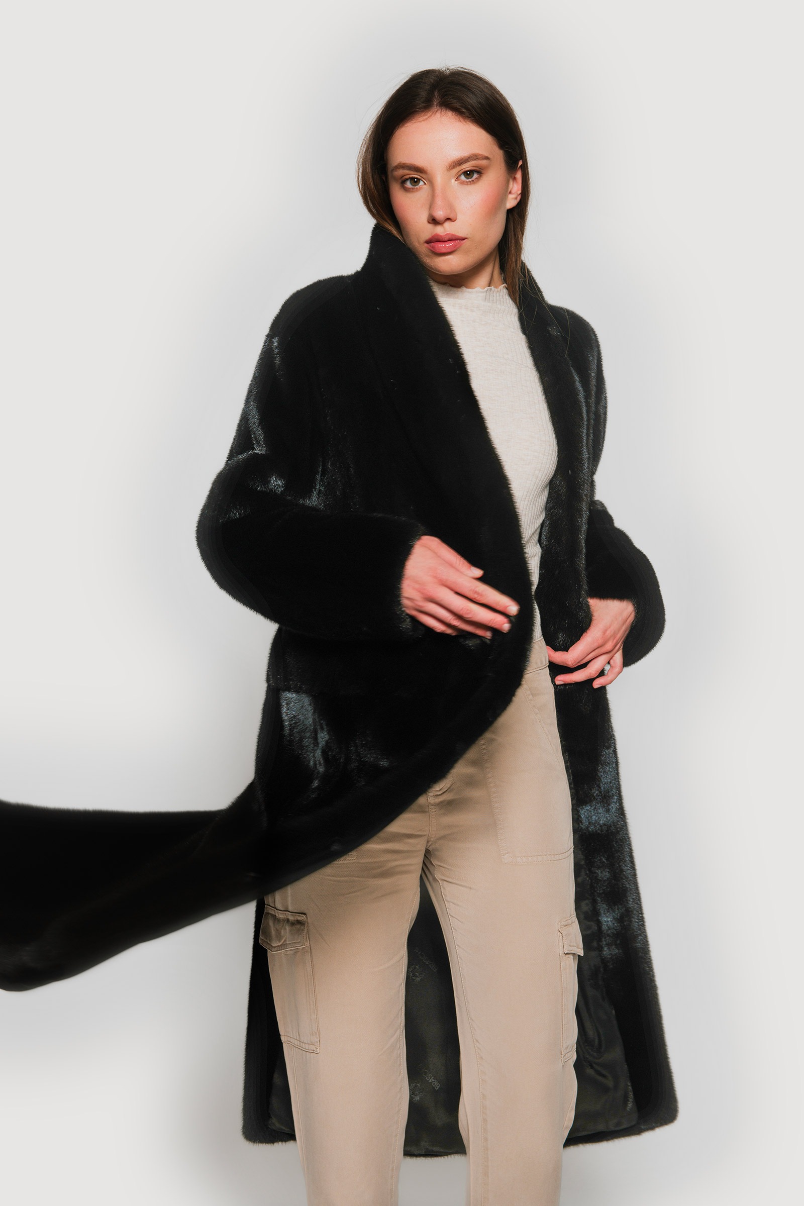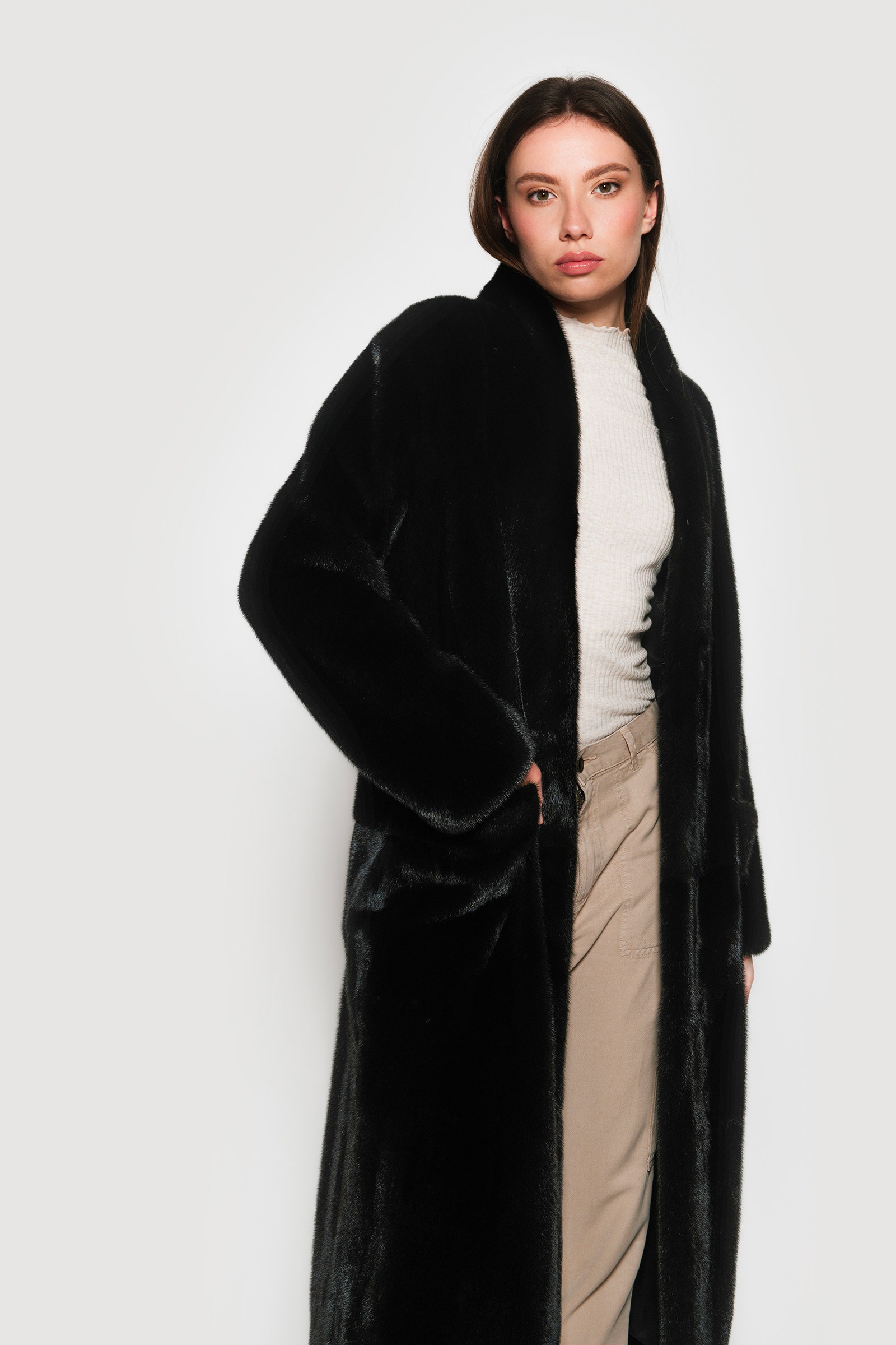 Long vertical mink jacket with shawl collar, button fastening, silk lining