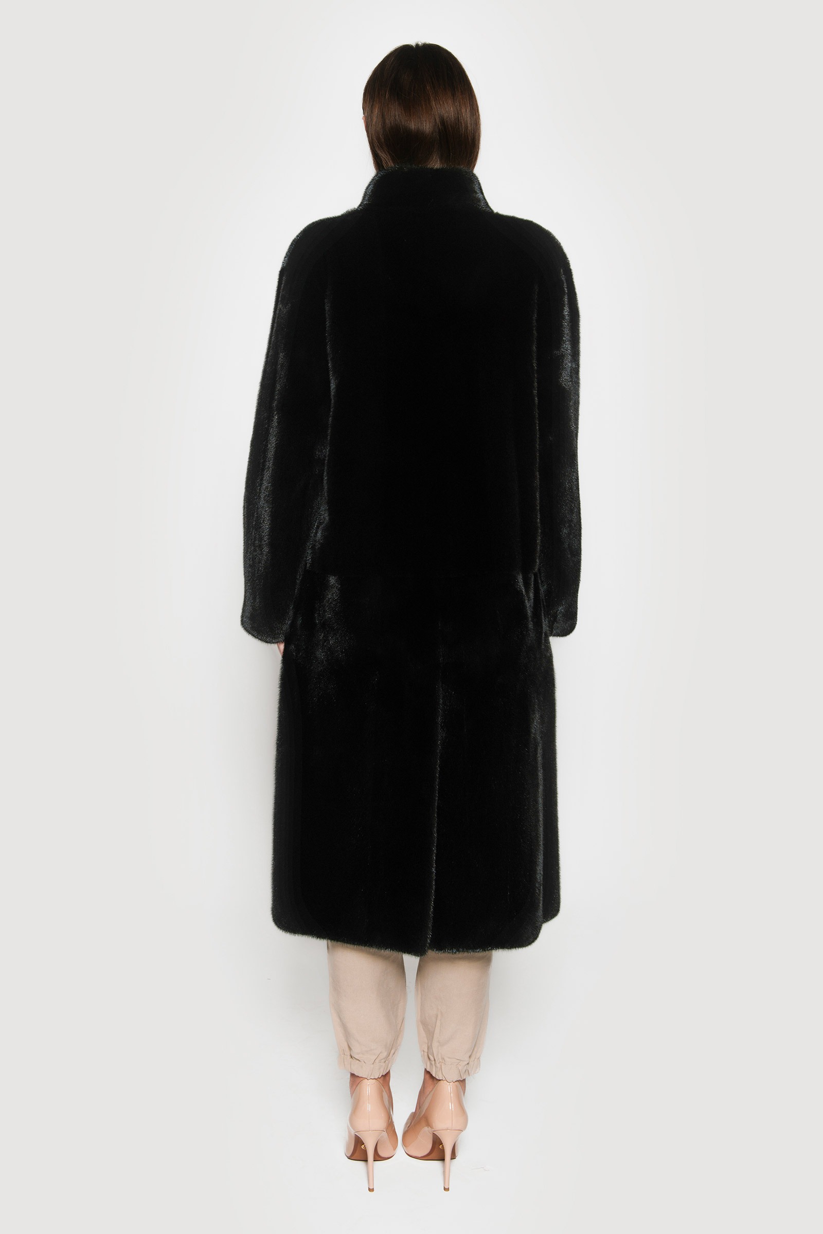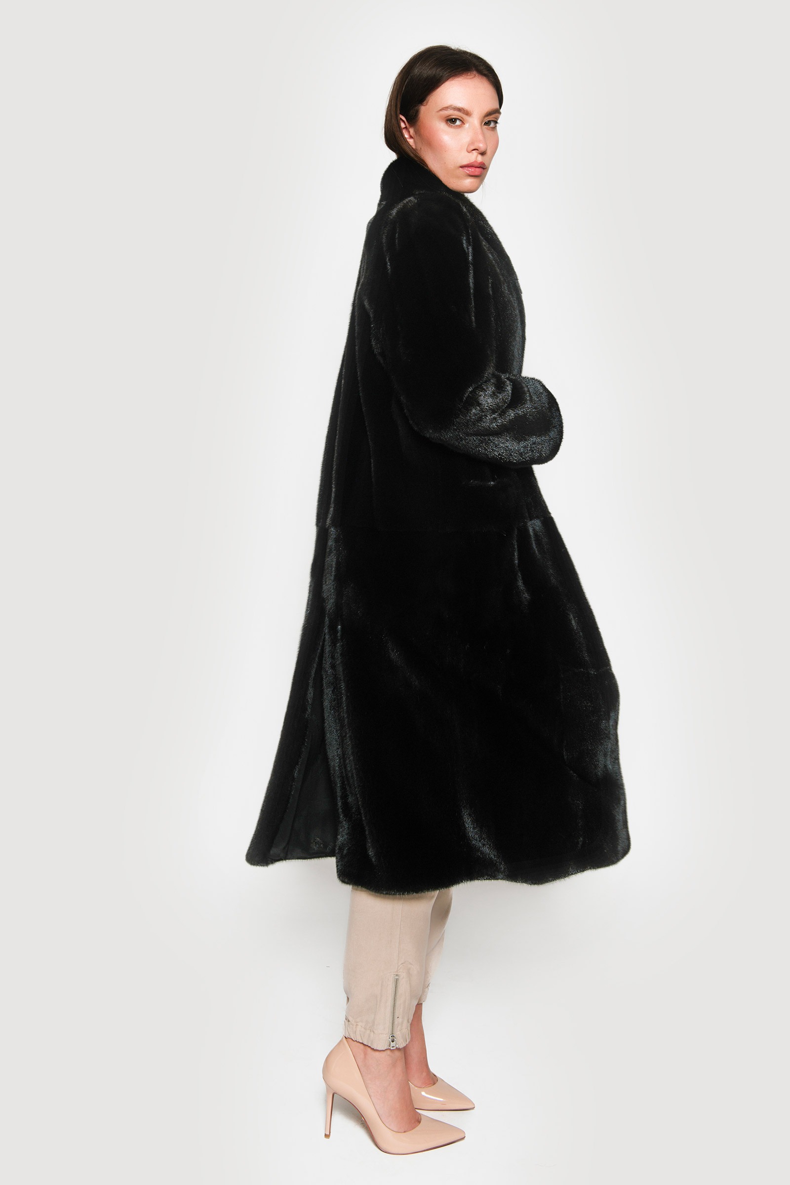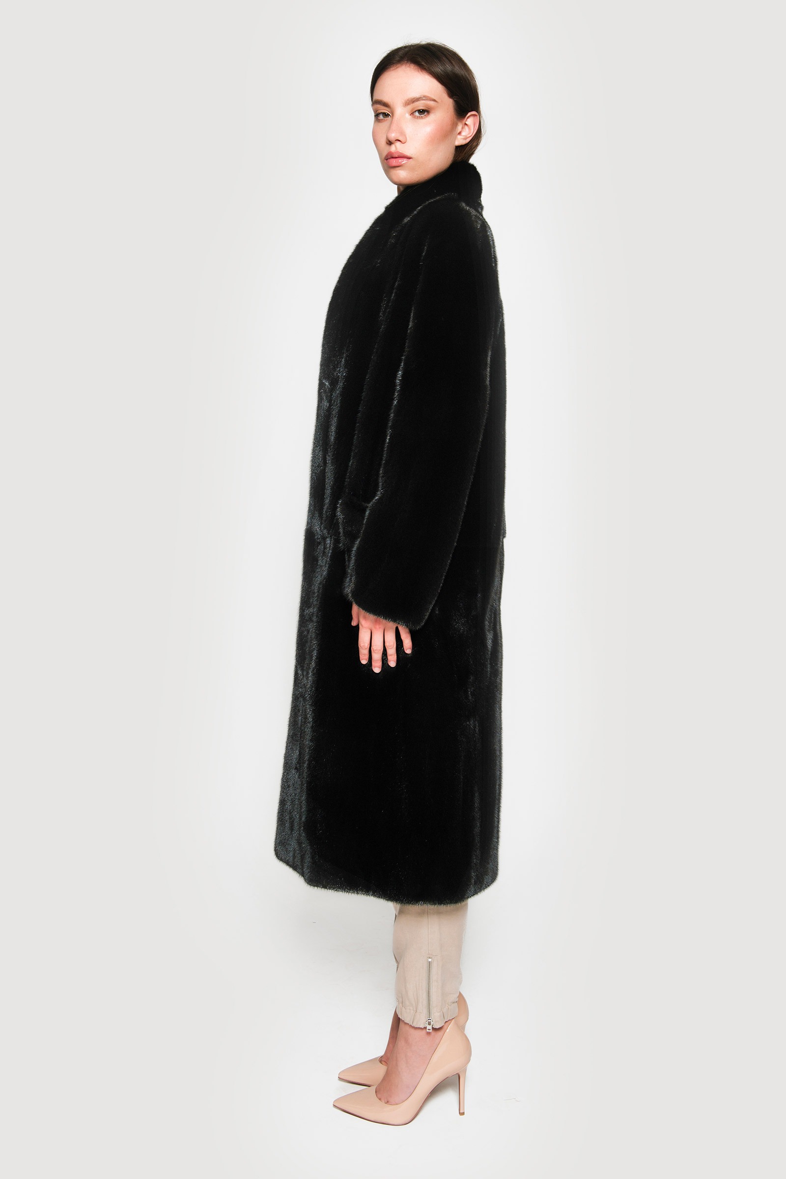 Long vertical mink jacket with shawl collar, button fastening, silk lining