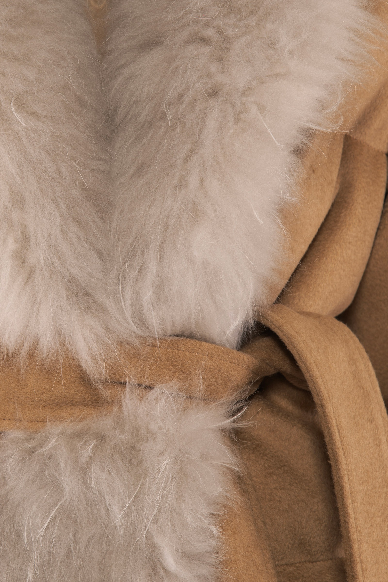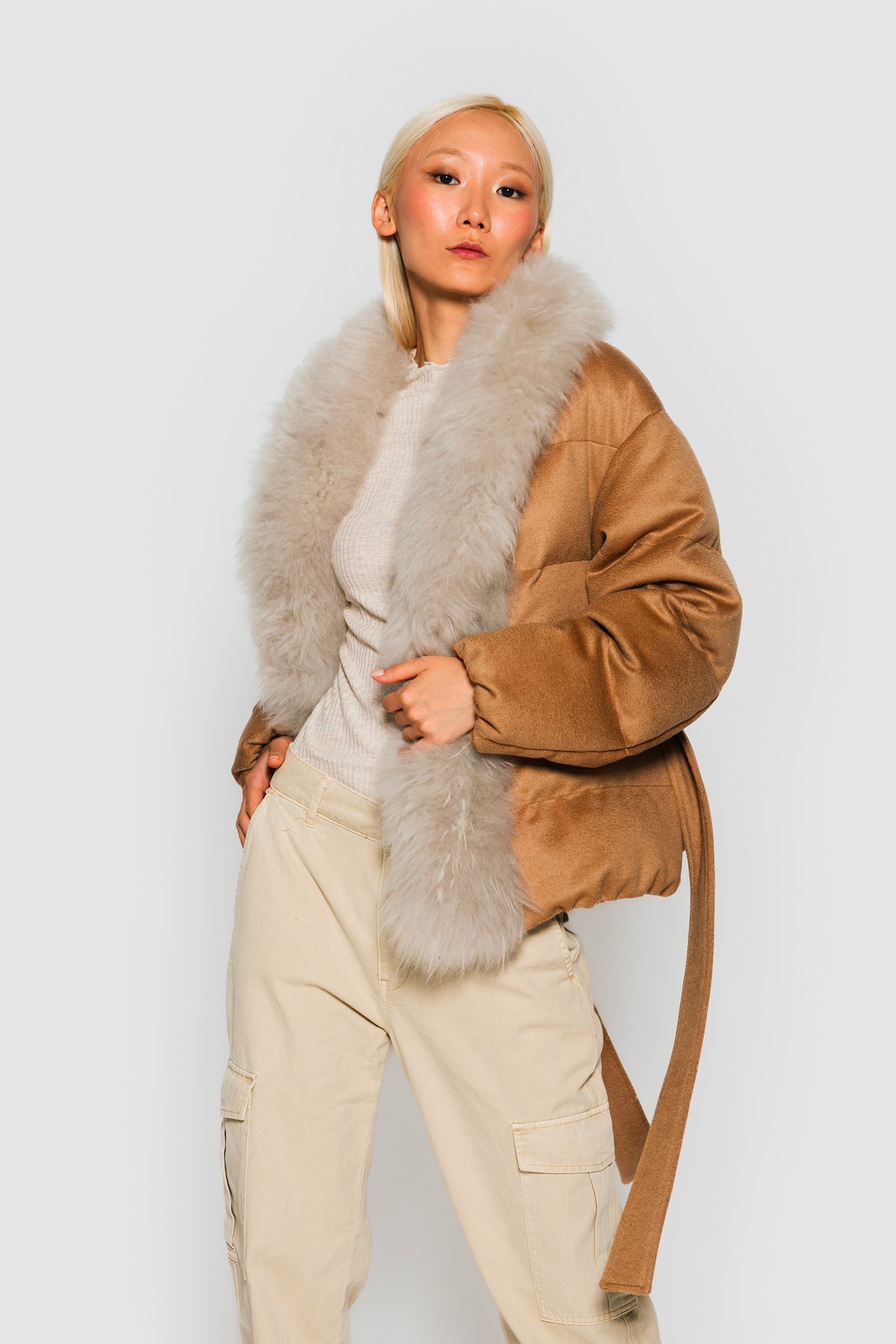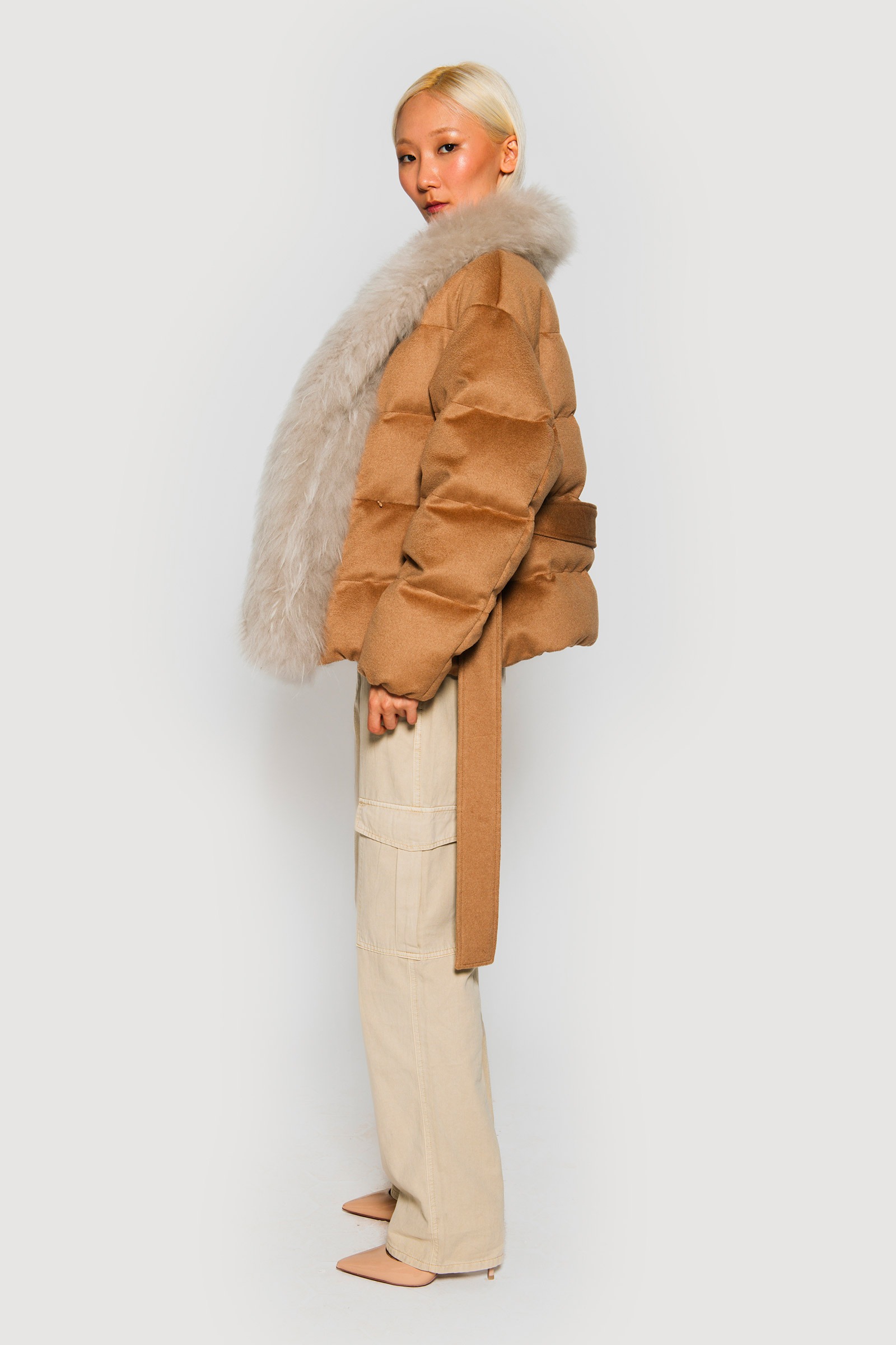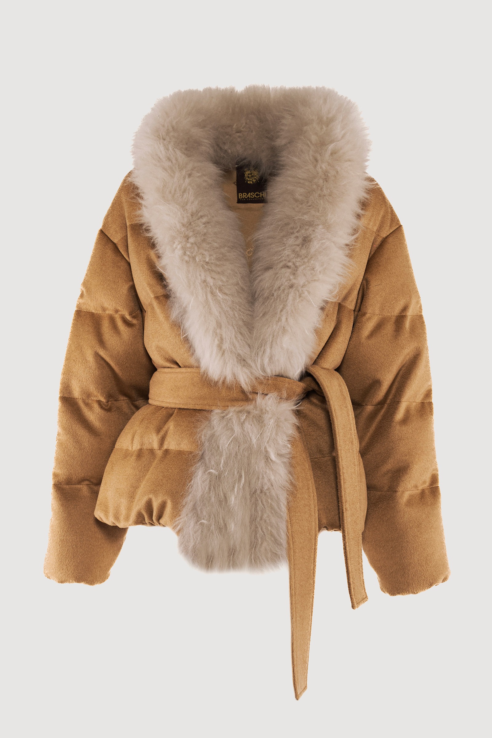 Cashmere down jacket loro piana storm system with mohair goat edge and collar, cashmere belt closure, silk lining