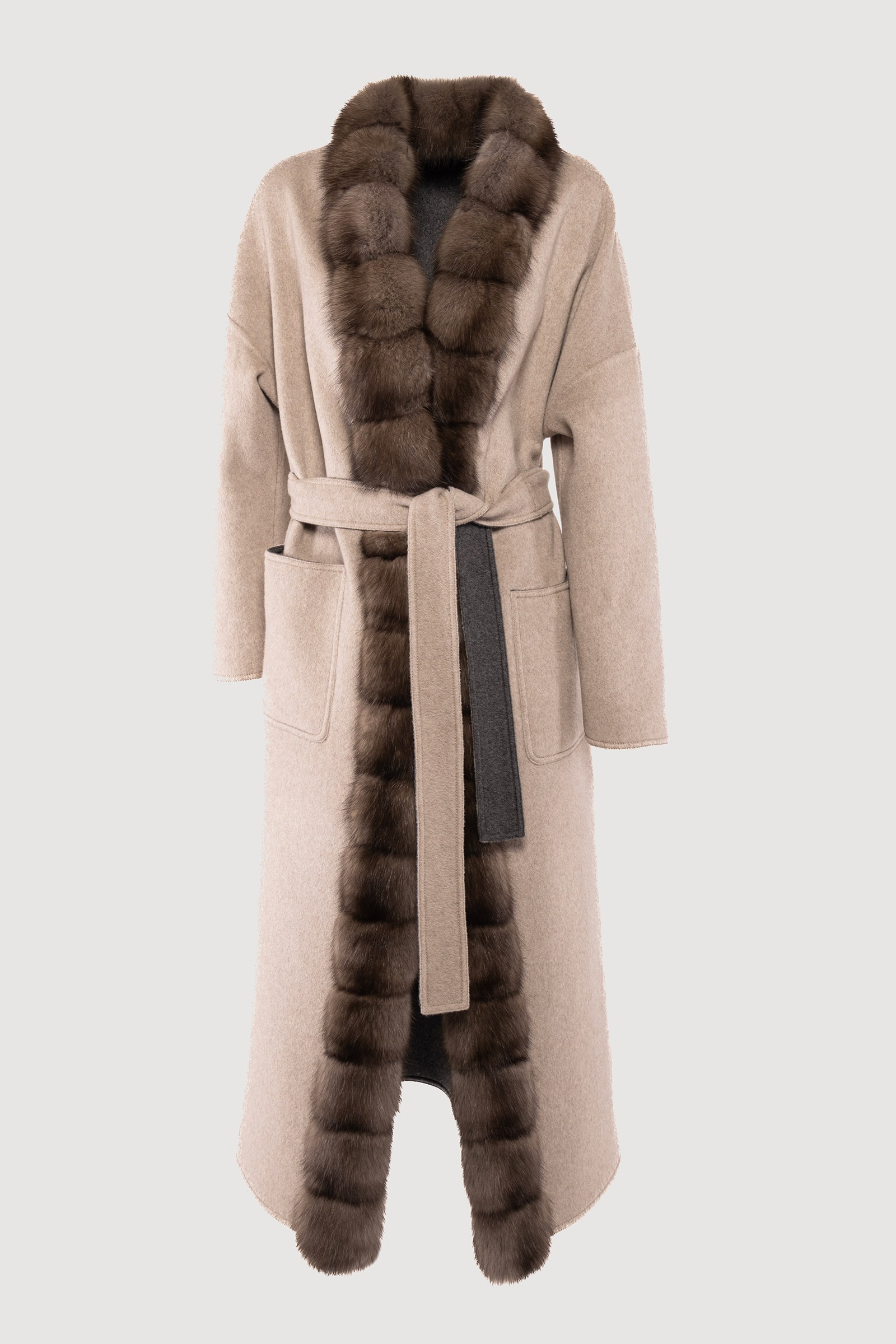 Cashmere their reversible flat with large pockets, edge and collar in graphite sable closure with cashmere belt