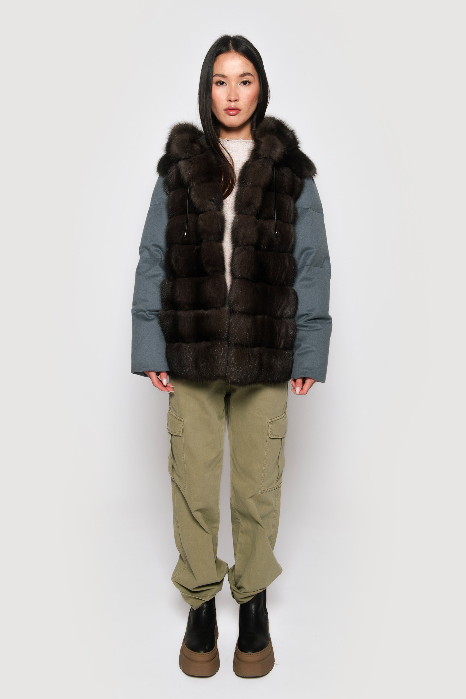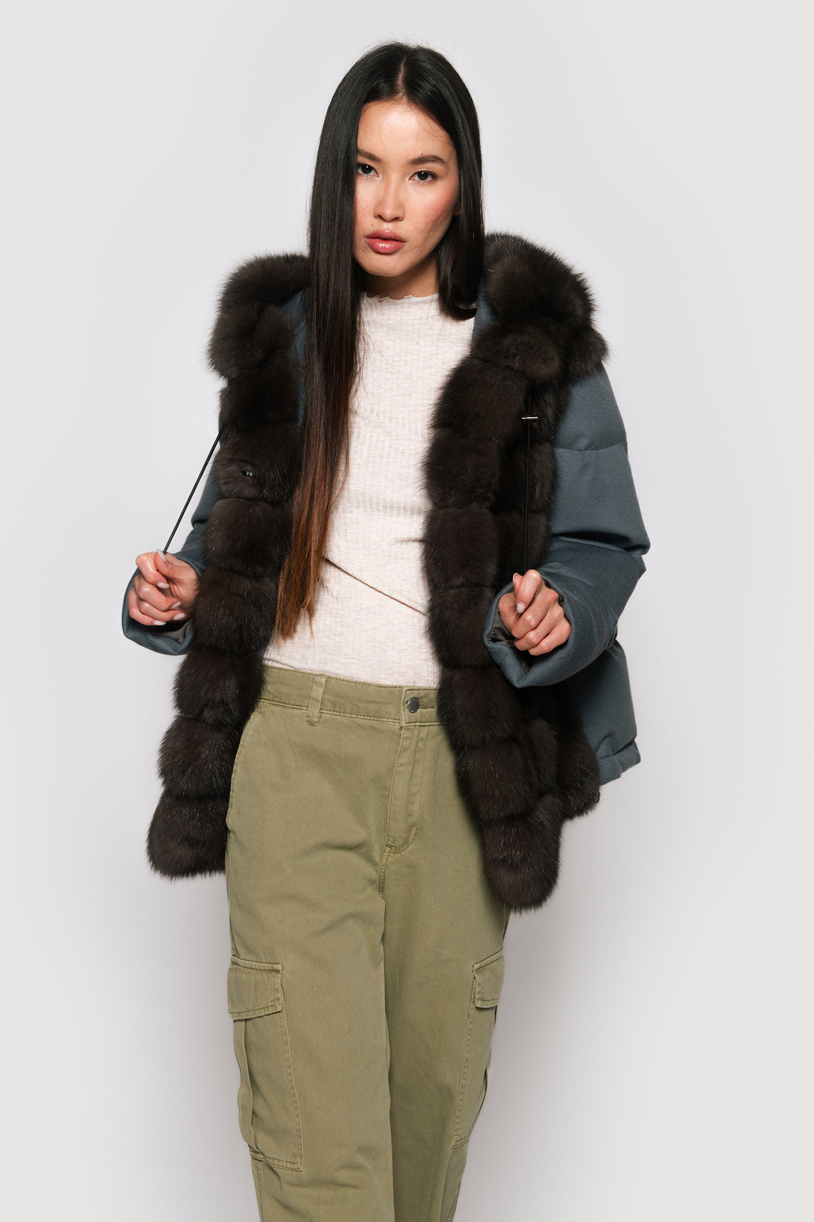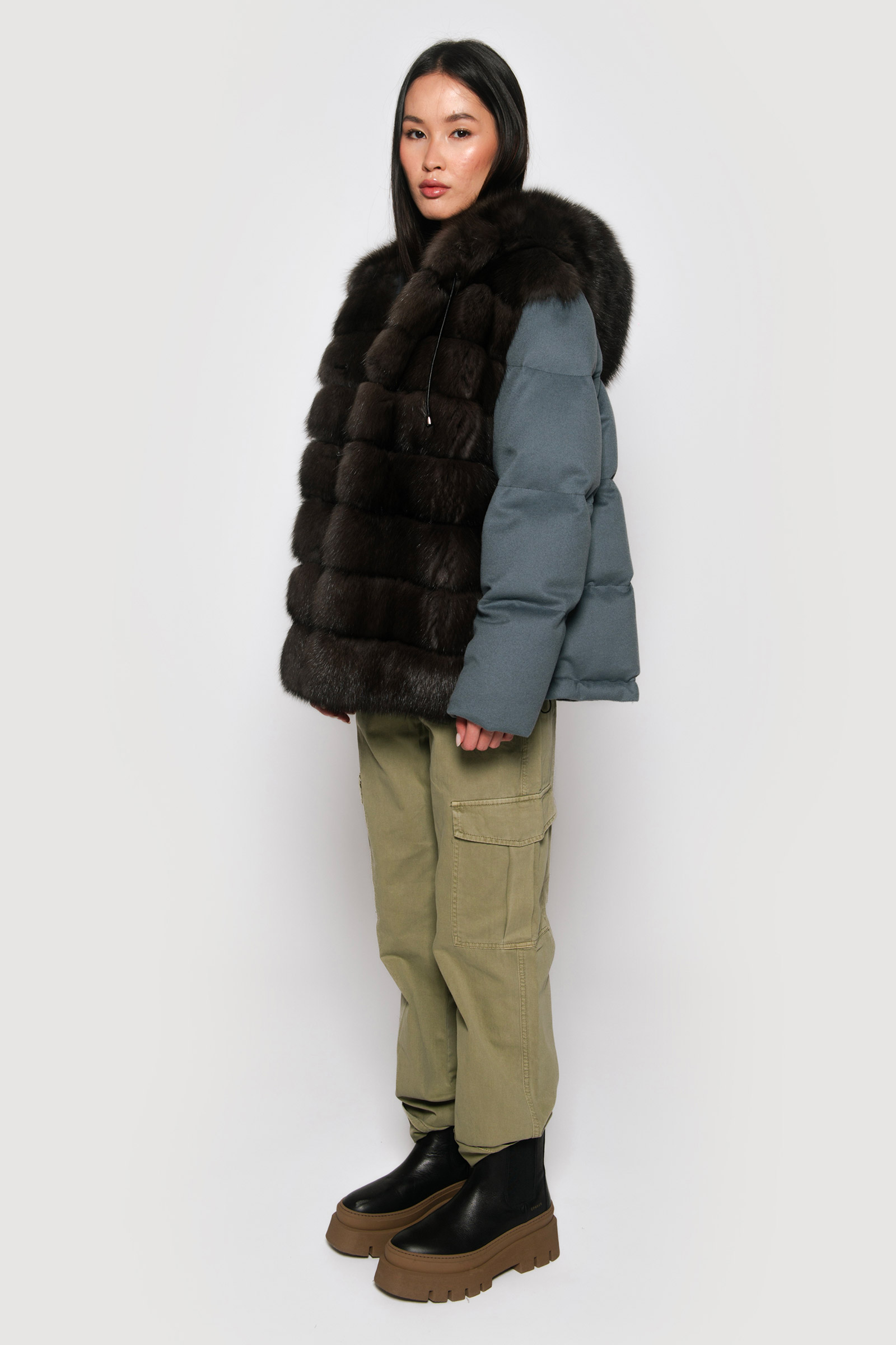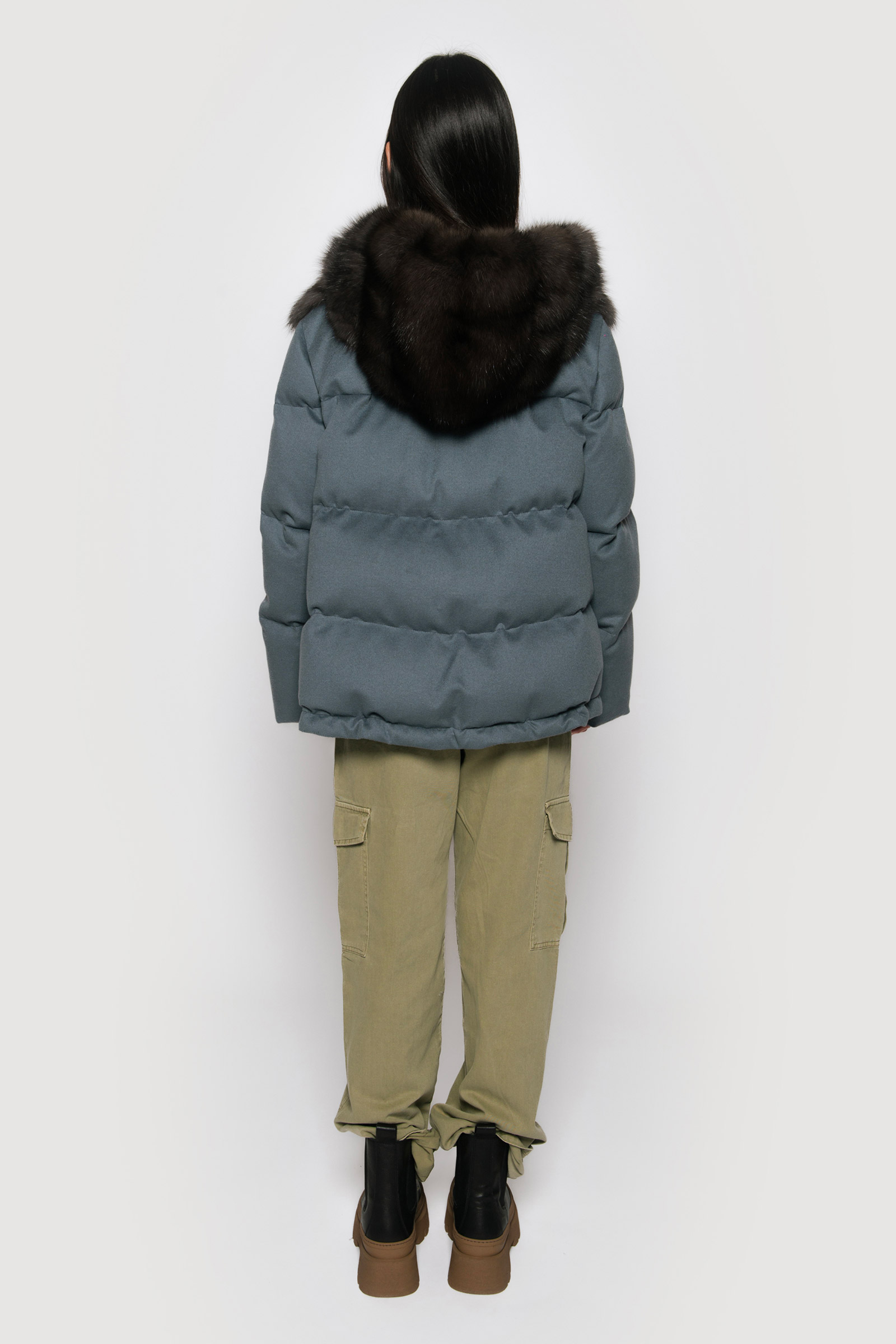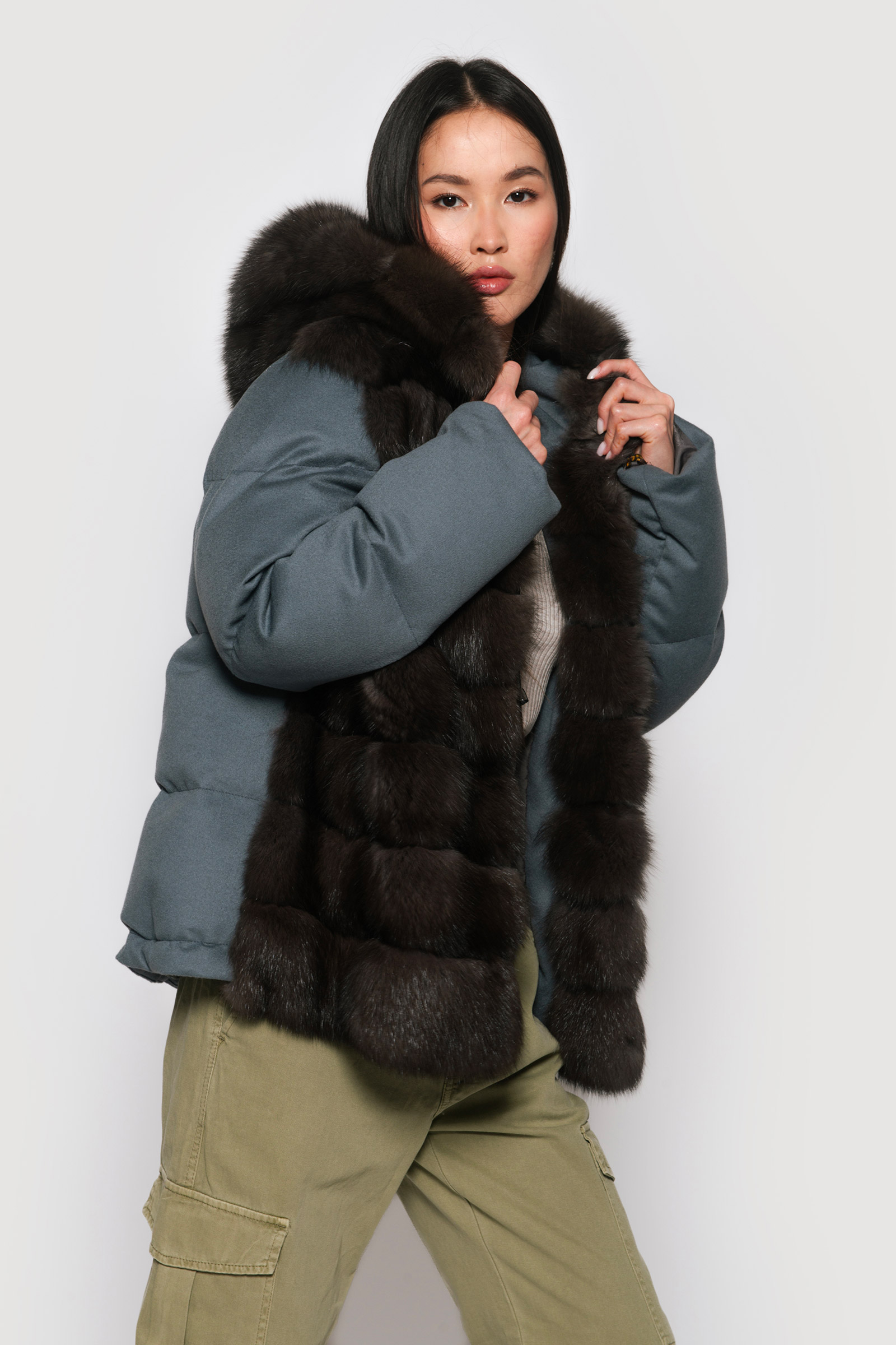 Wrap yourself in opulence with Braschi’s Cashmere Loro Piana Flat Storm System. This luxurious piece in grey and blue features secure hook closures and a sable hood, adding a touch of sophistication and warmth to your ensemble. Elevate your style with Braschi’s impeccable craftsmanship, where fashion meets luxury.