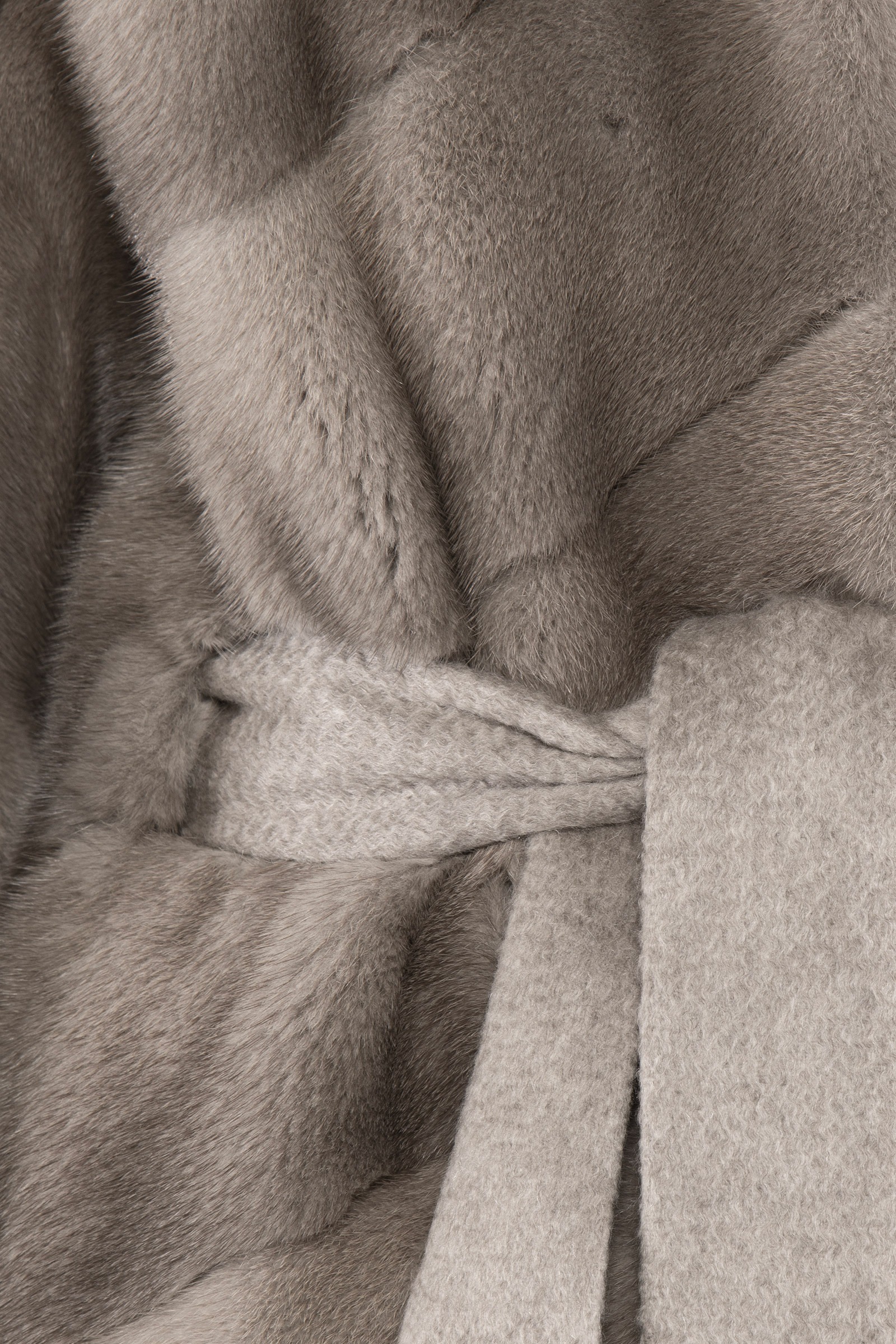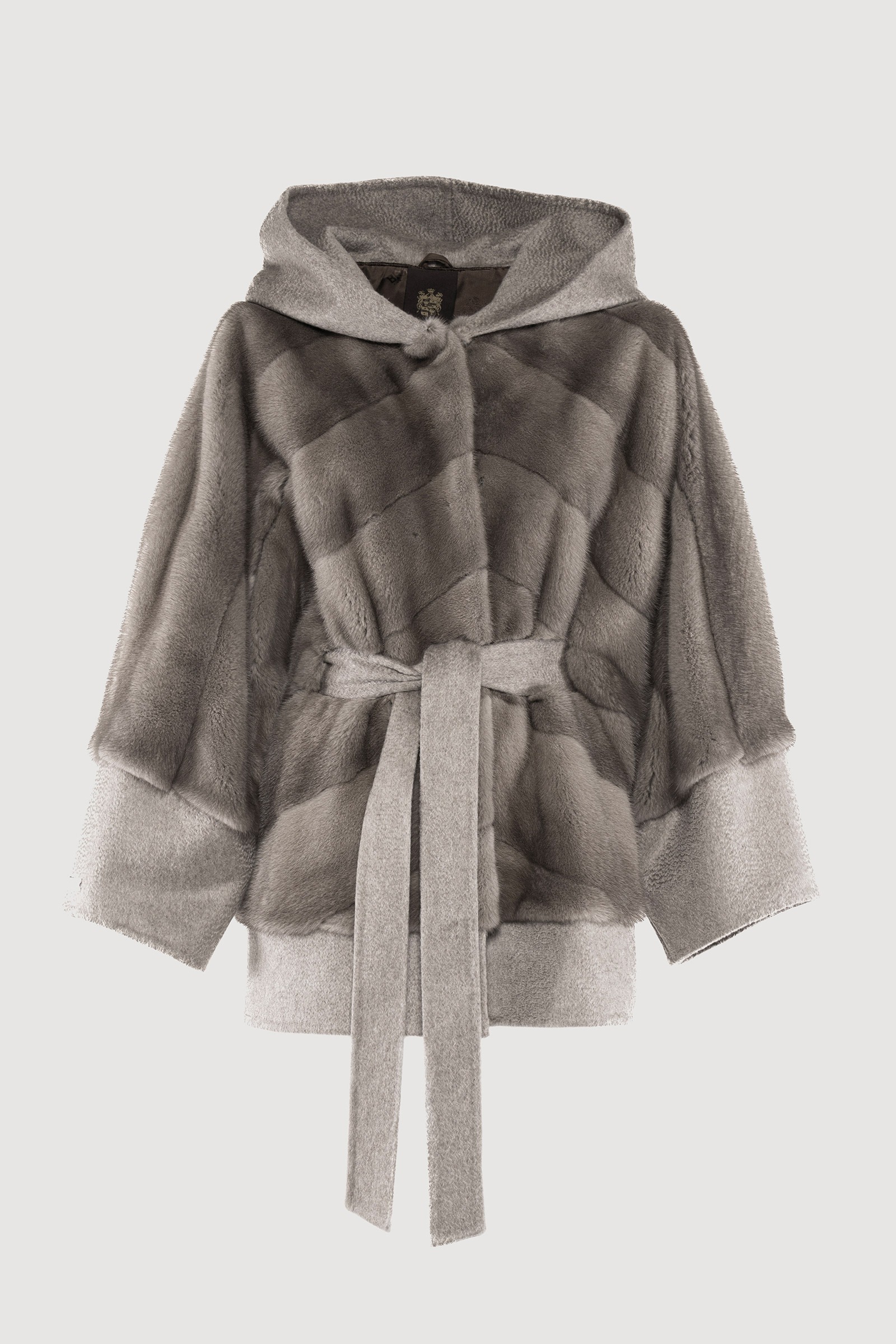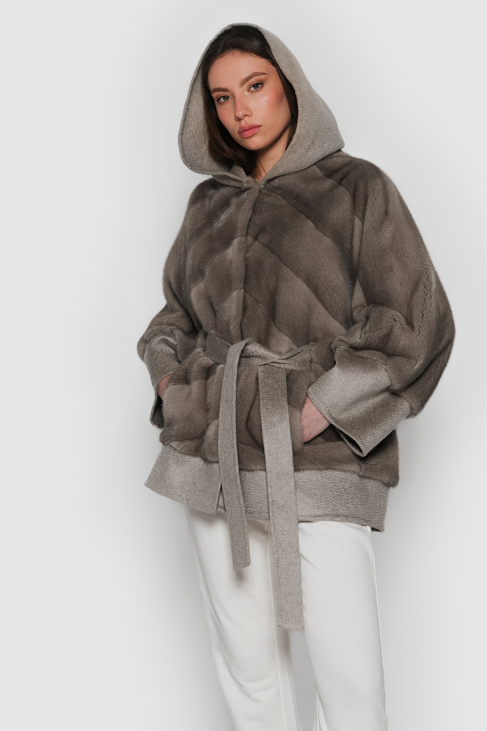 Mink jacket with diagonal processing with cashmere details and hood, button closure and cshmere belt