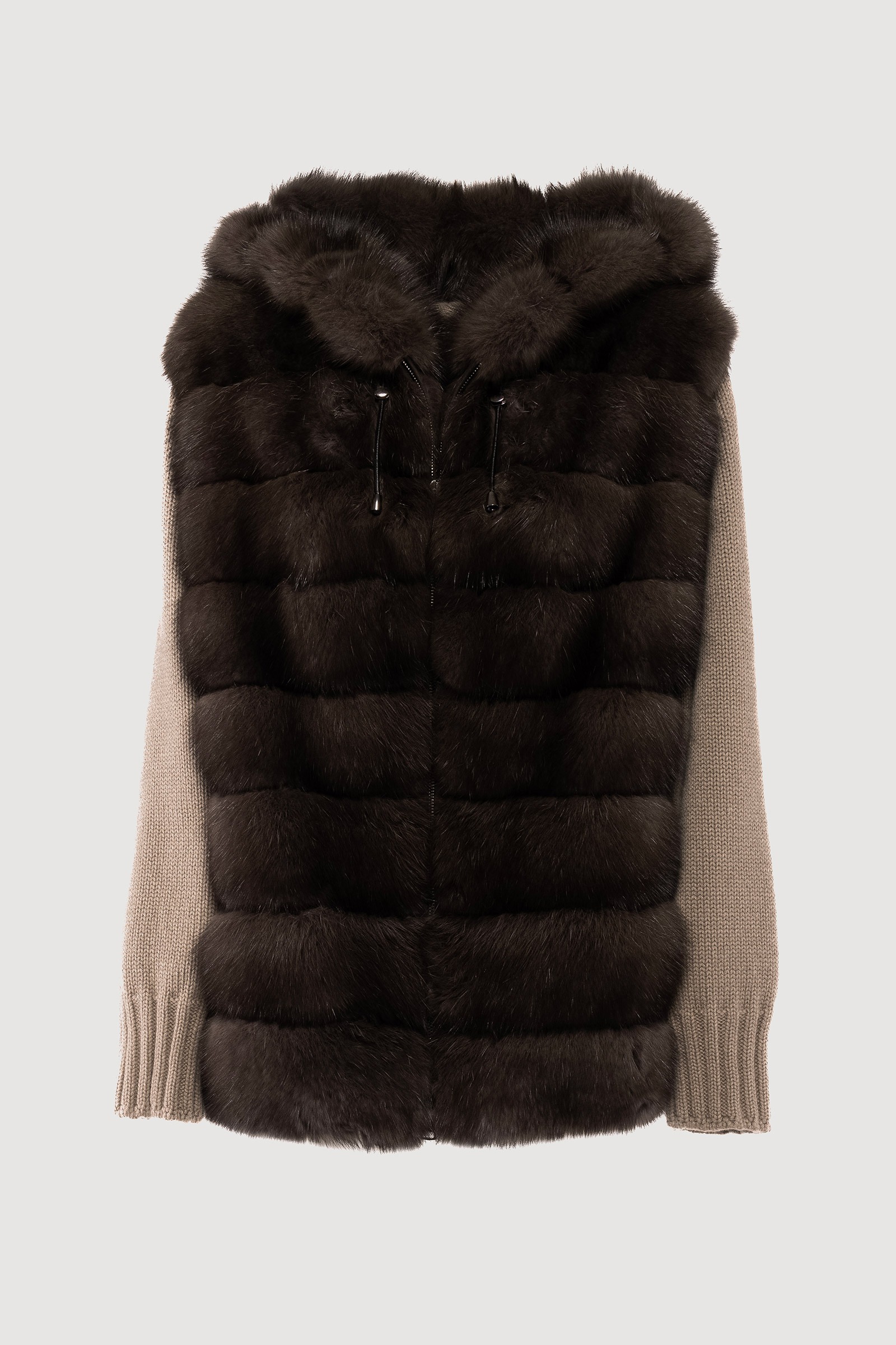 Eclipse sable hood, collar and front strap, back workmanship, zip closure.