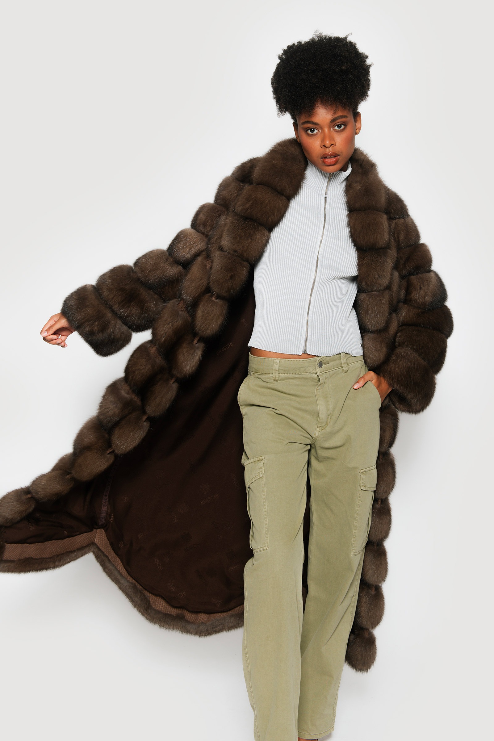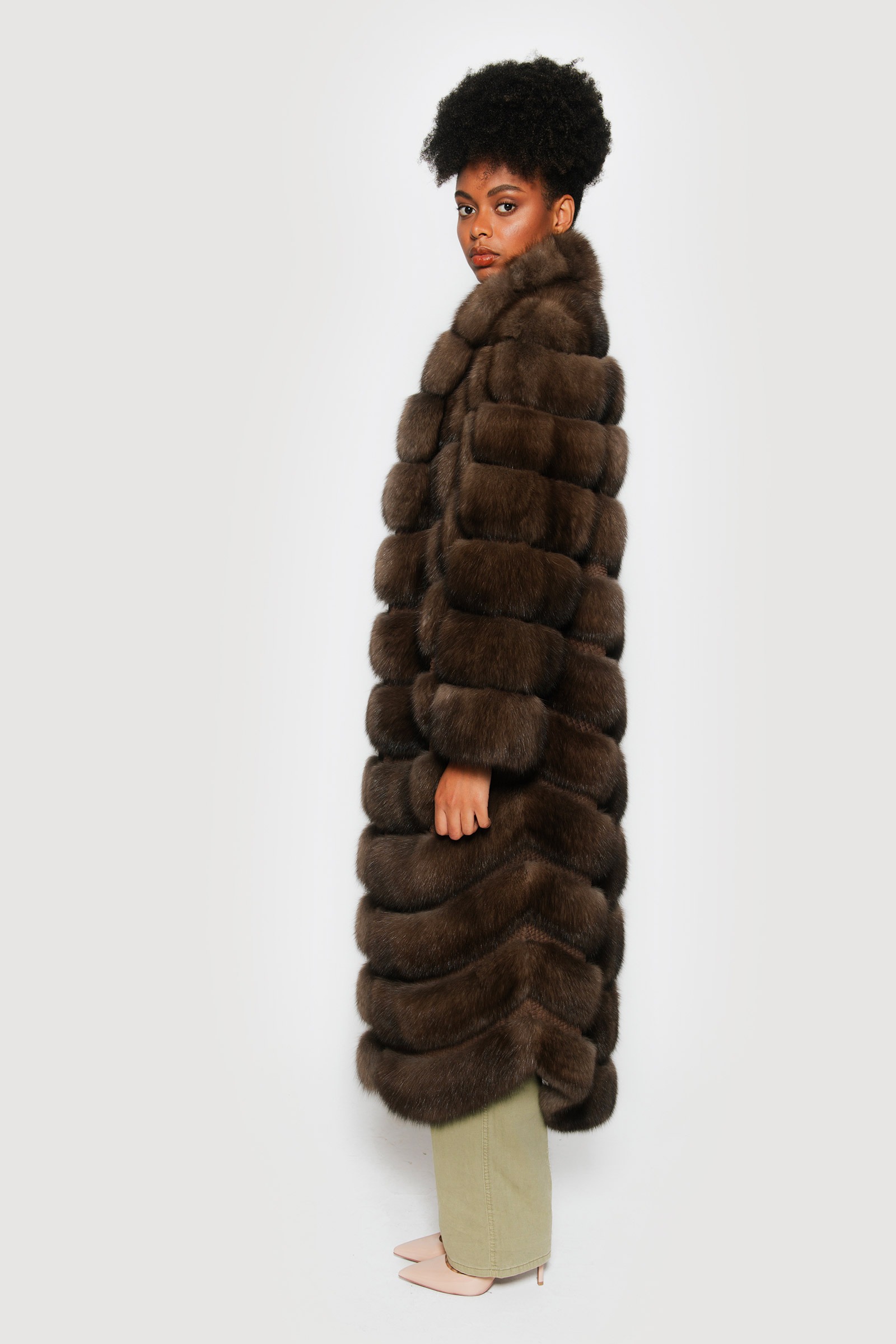 Long graphite sable coat, horizontal workmanship with python joints and shawl collar.