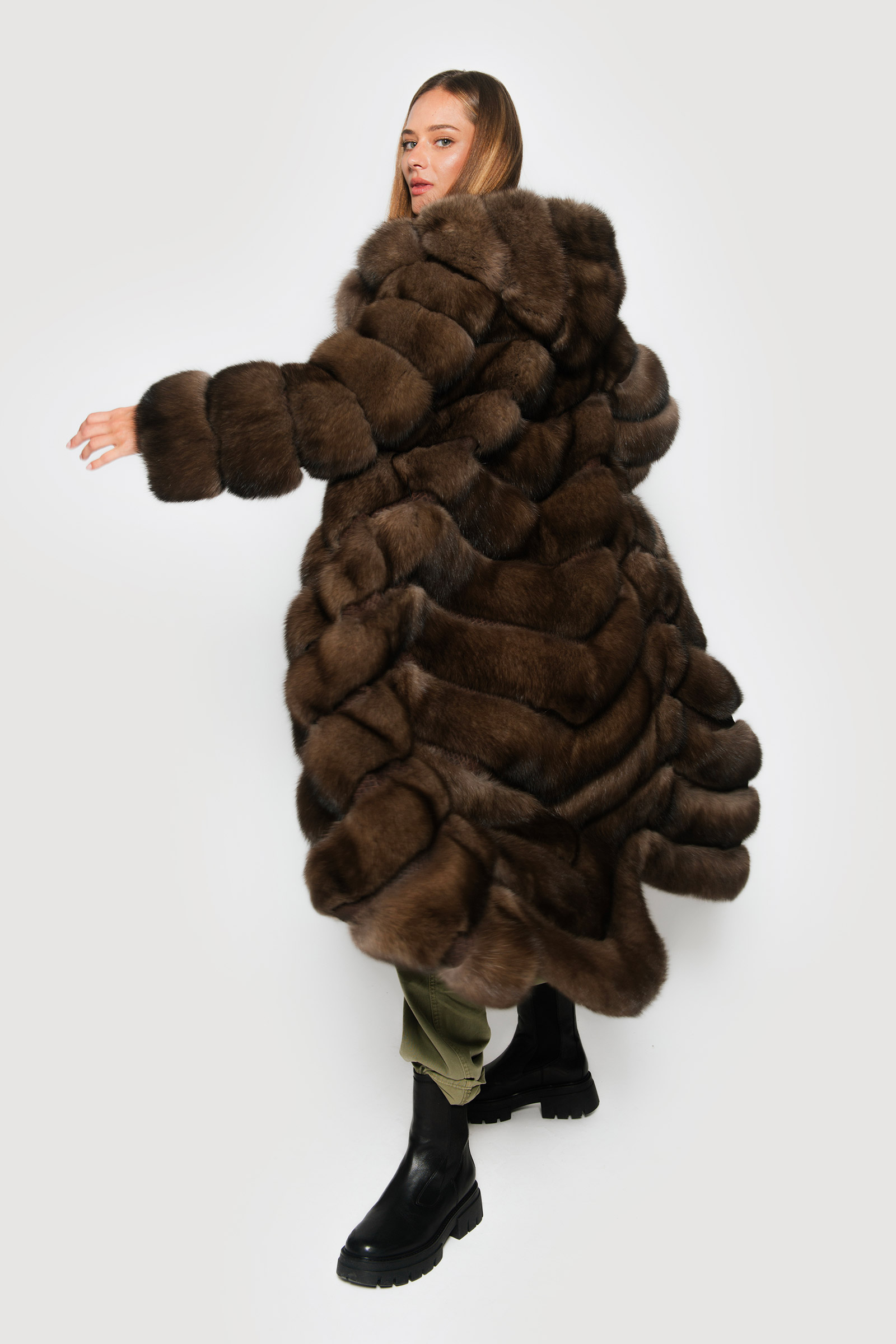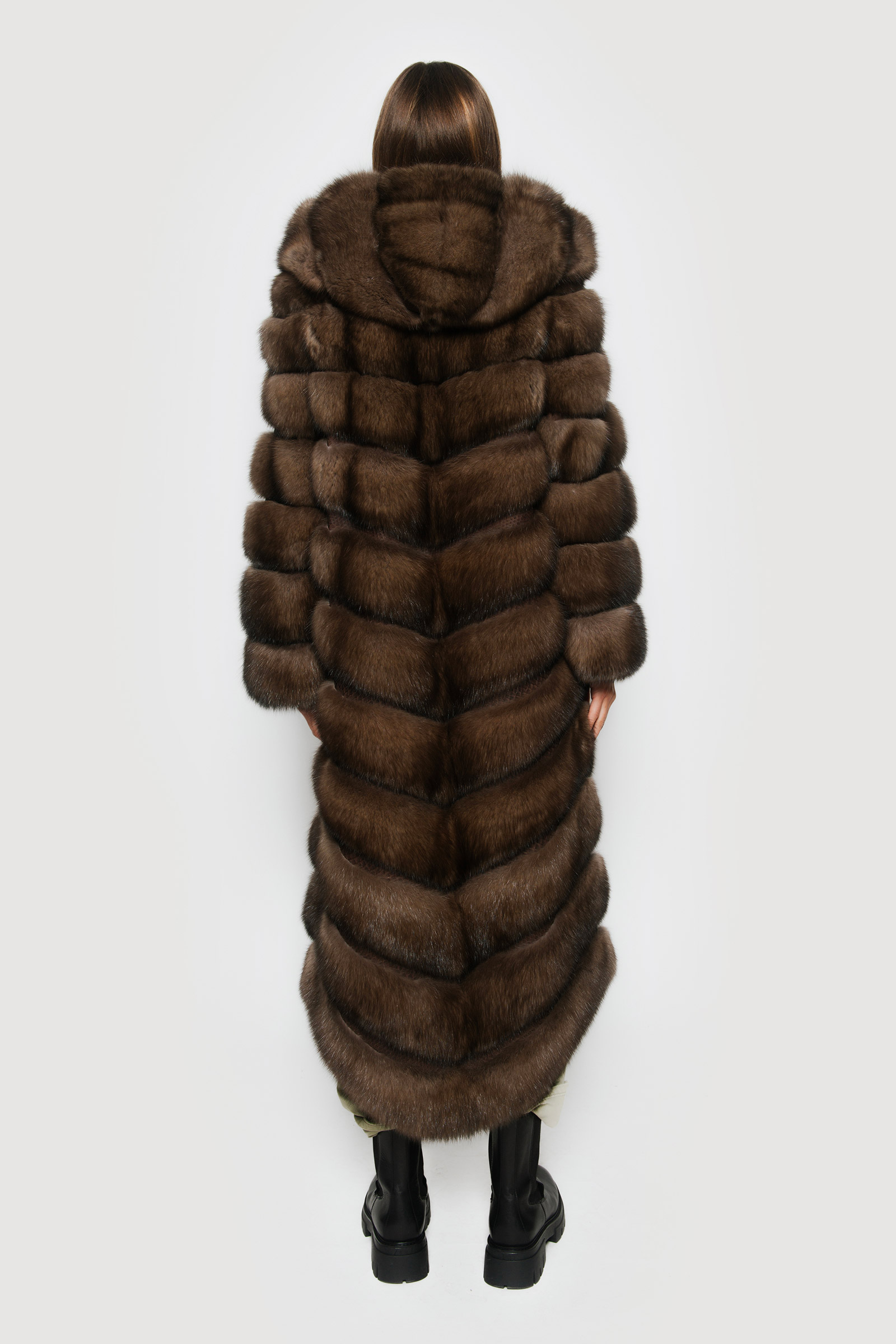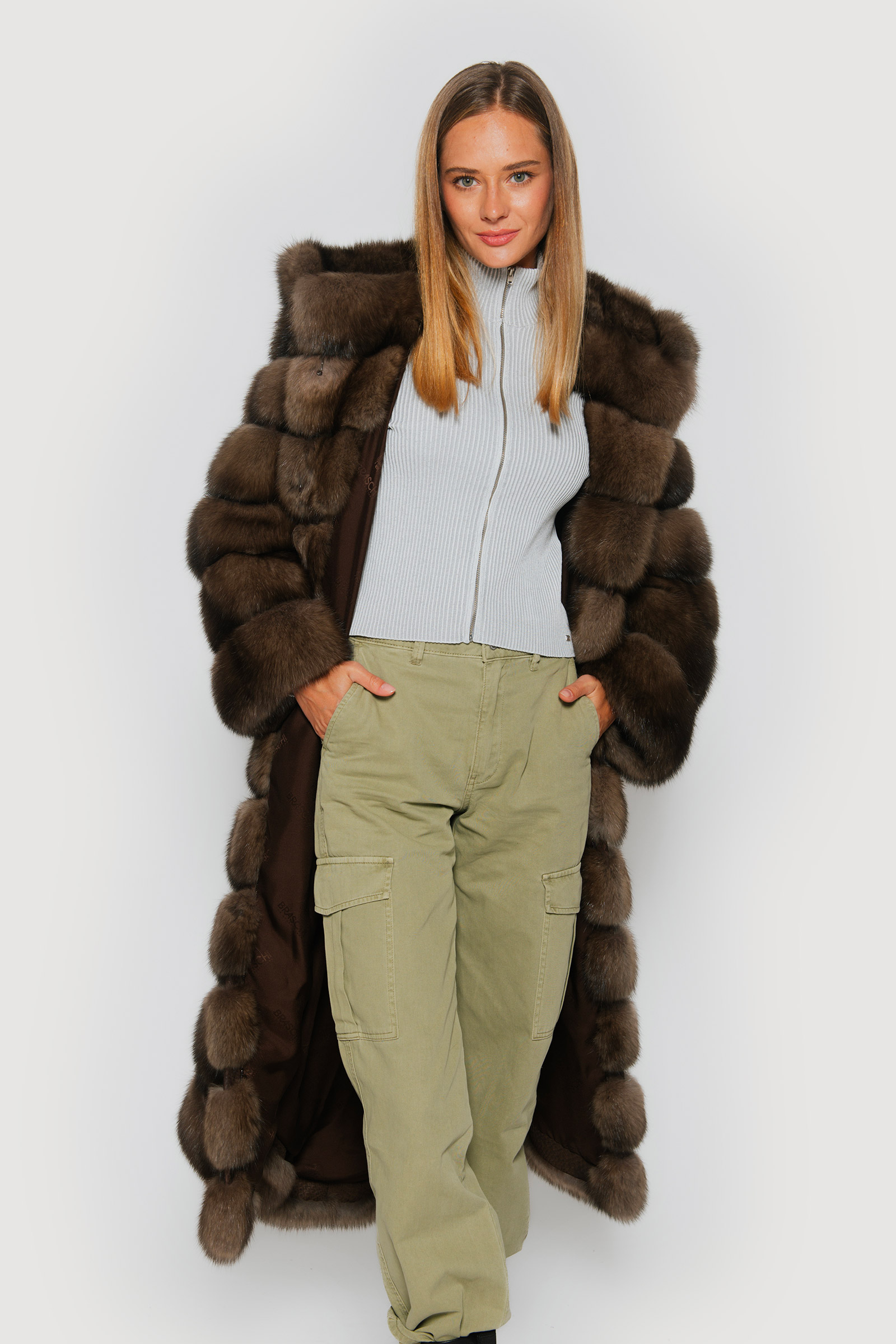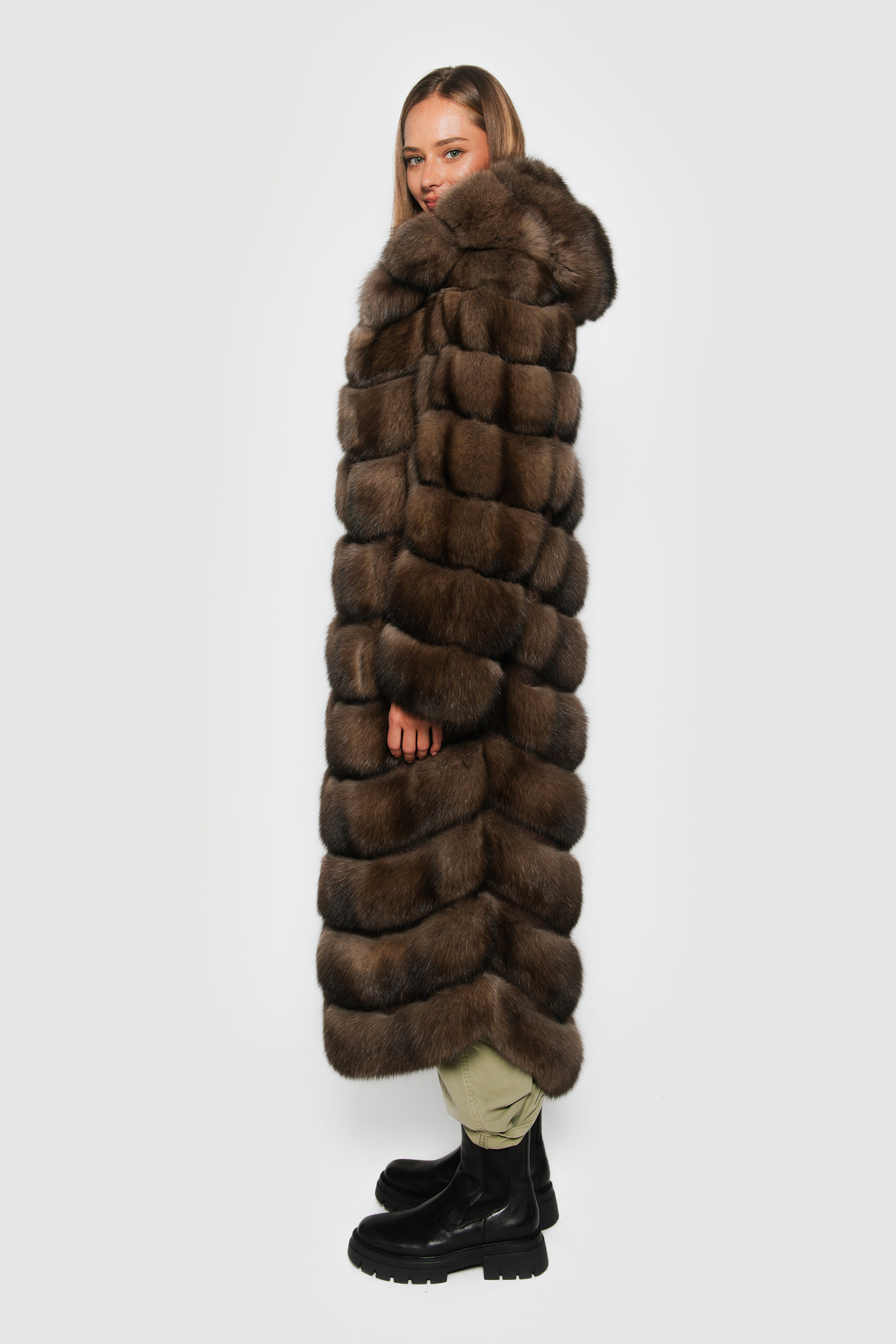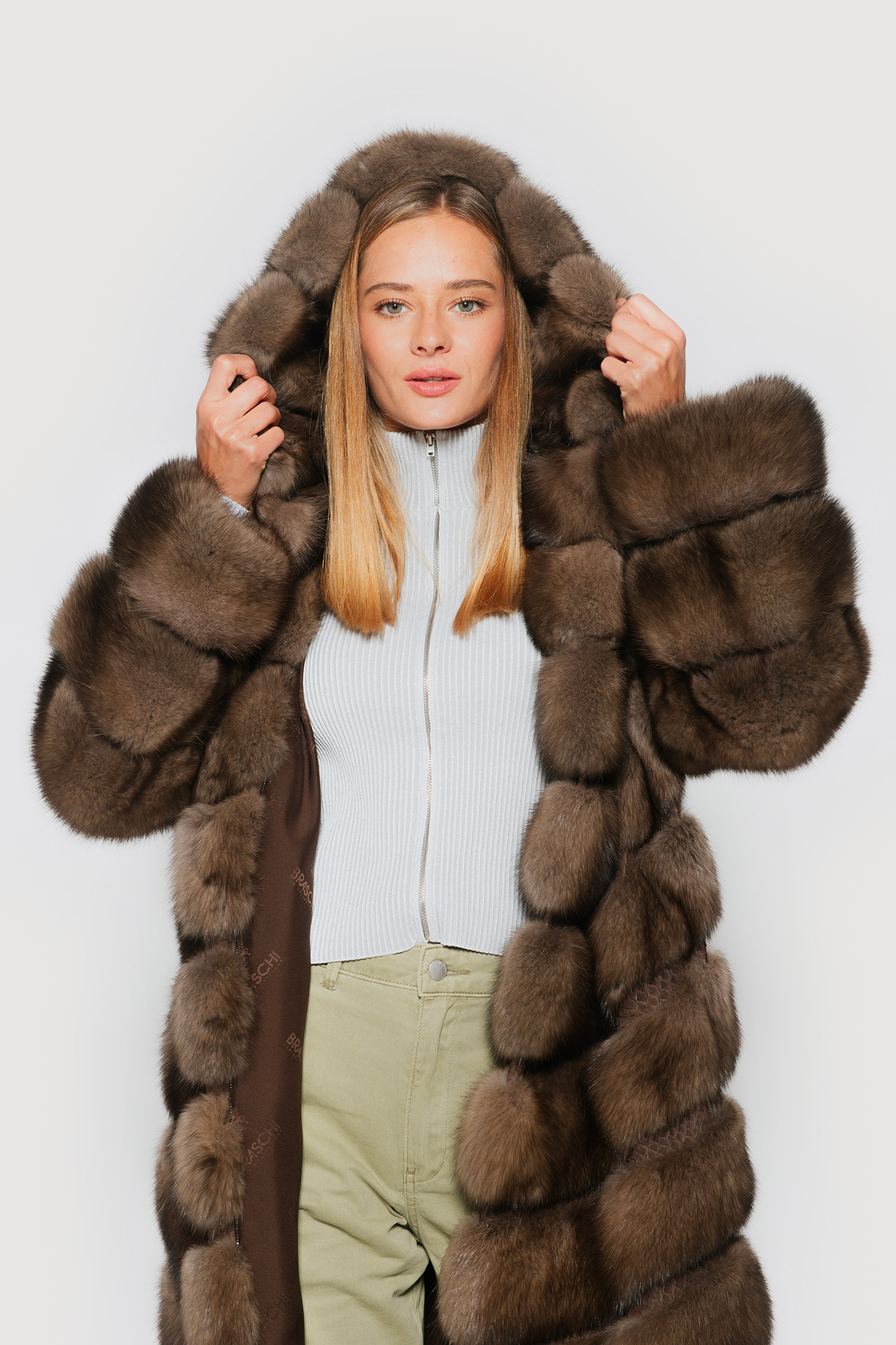 Elevate your style to new heights with Braschi’s long graphite sable jacket. Italian-crafted to perfection, it showcases horizontal workmanship with distinctive python joints and a luxurious hood, all complemented by sumptuous silk lining for unparalleled comfort and opulence. Discover the epitome of elegance and craftsmanship with Braschi, where fashion meets luxury.