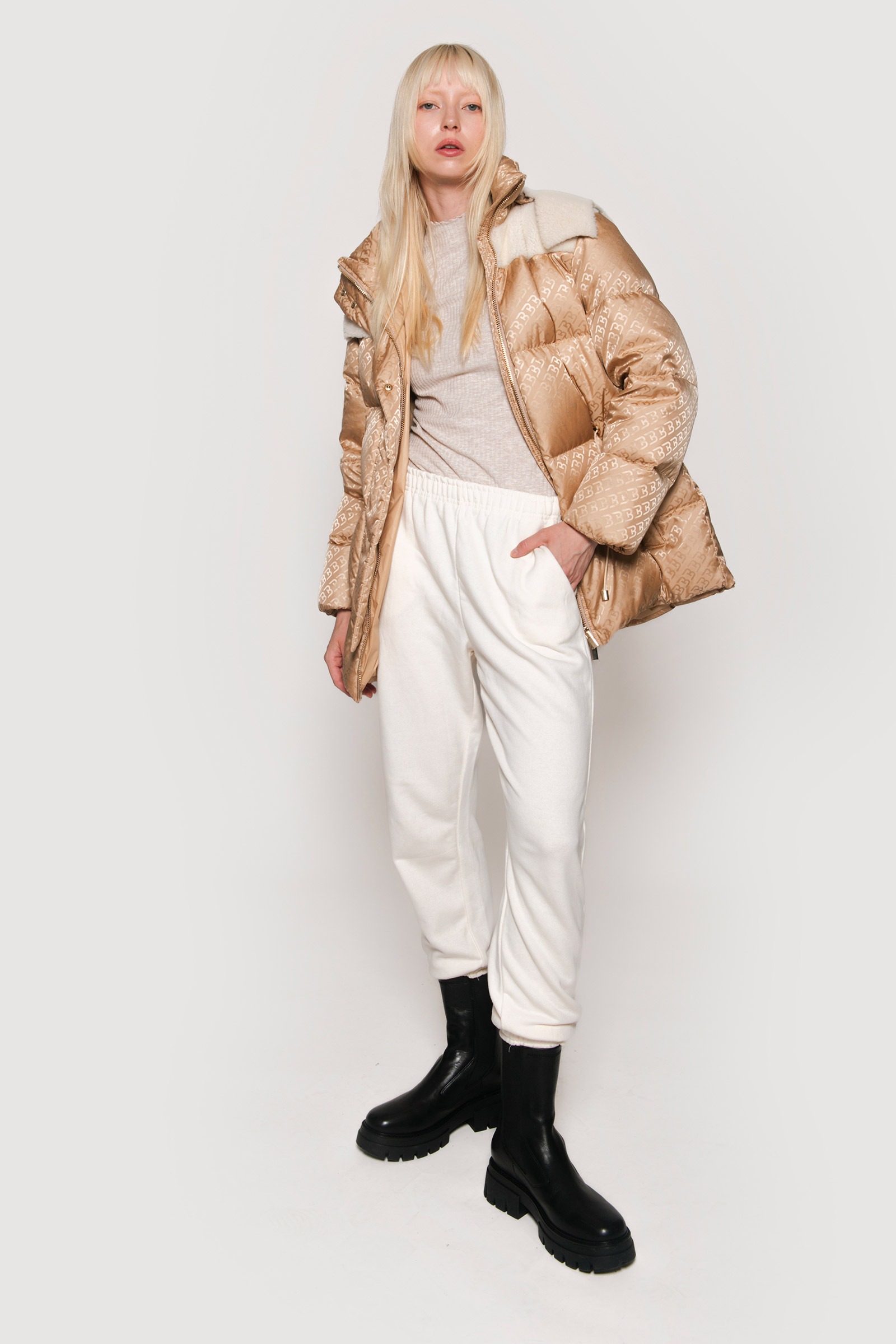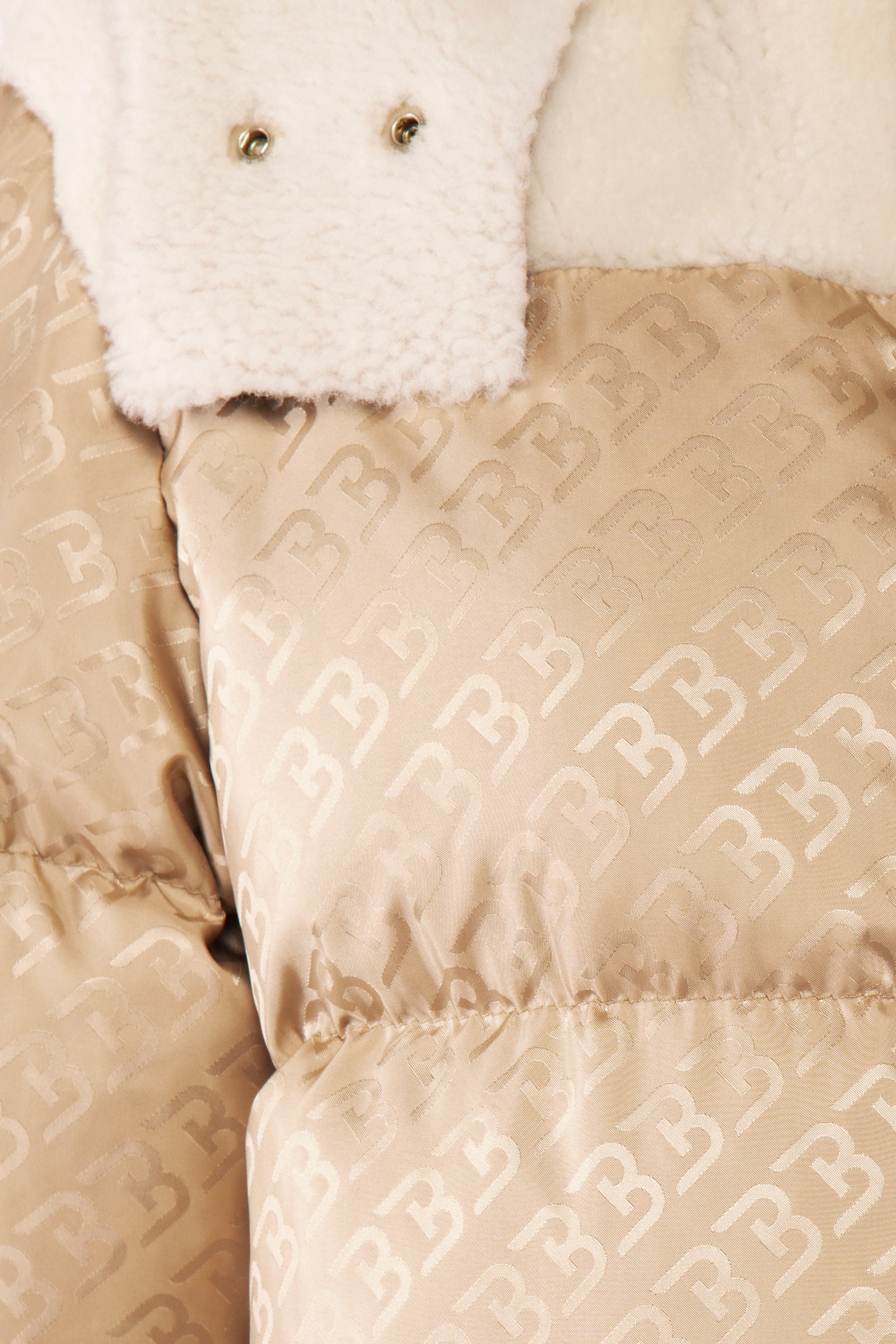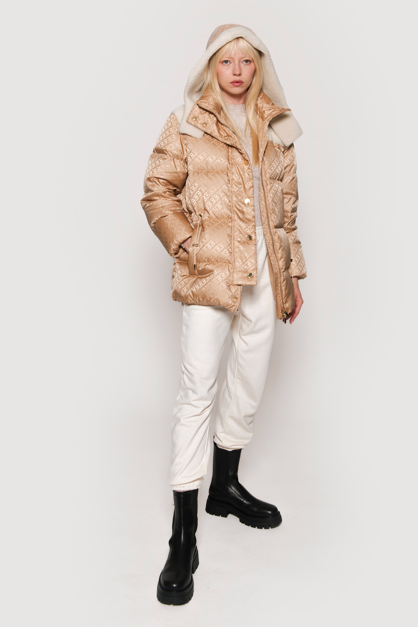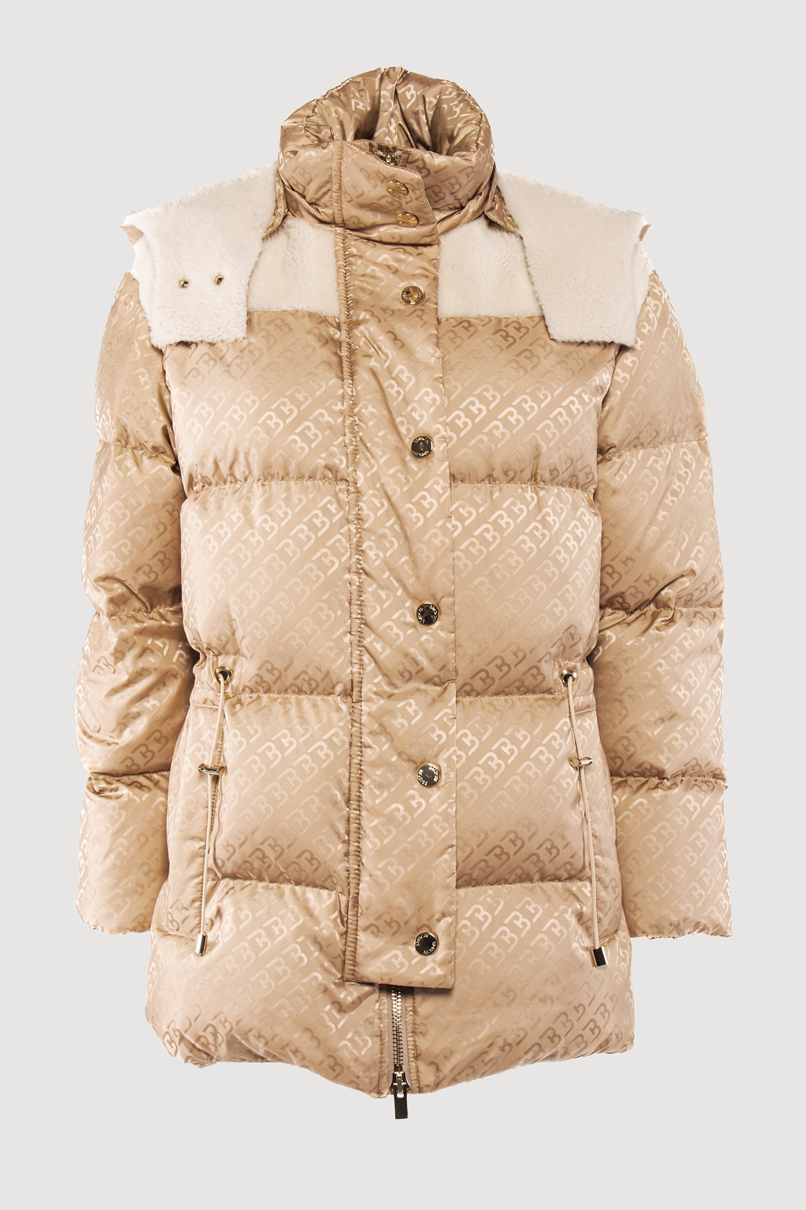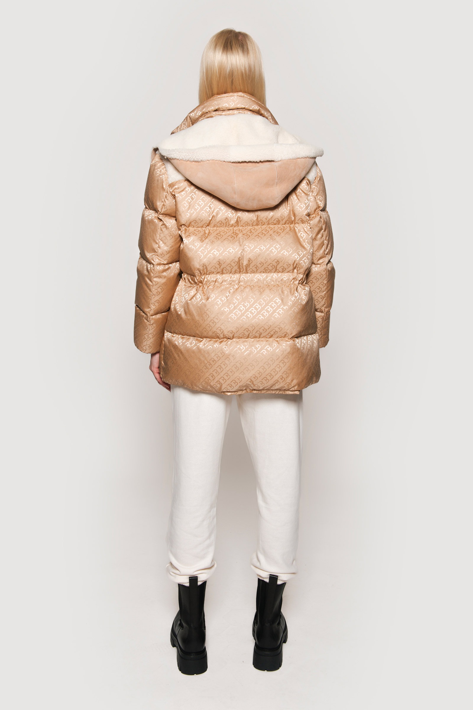 Merino shearling hood and details, logo fabric pattern closure with snap buttons