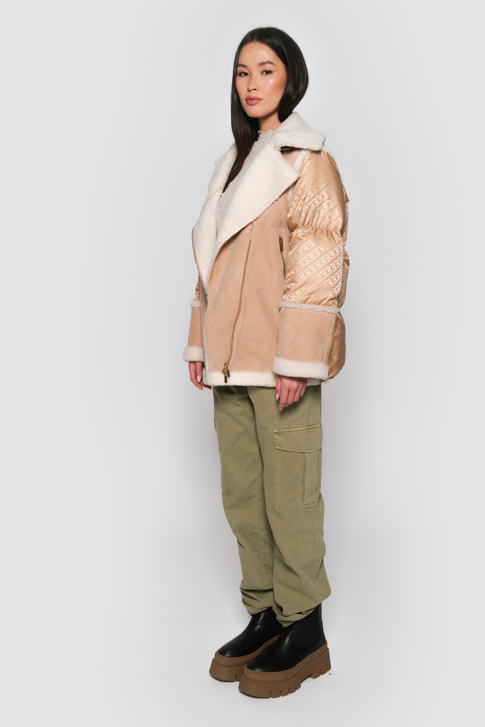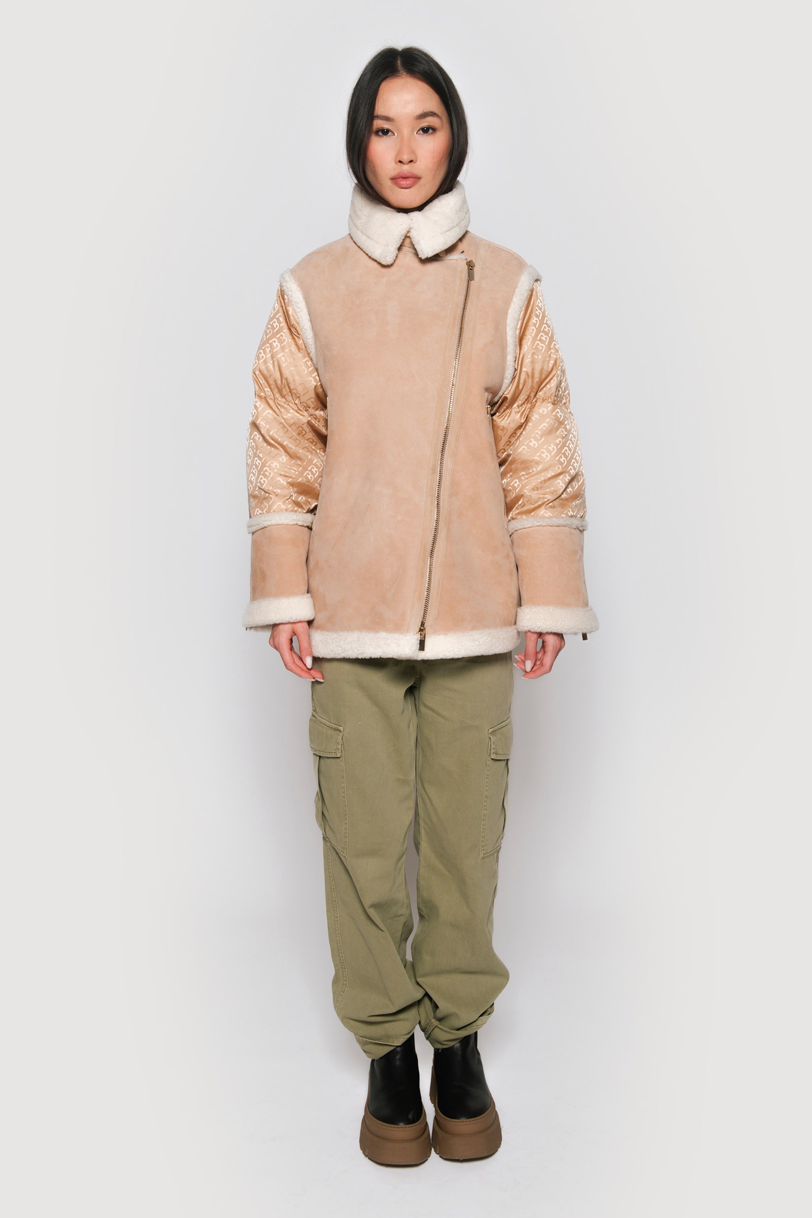 Logoed down jacket and light camel shearling