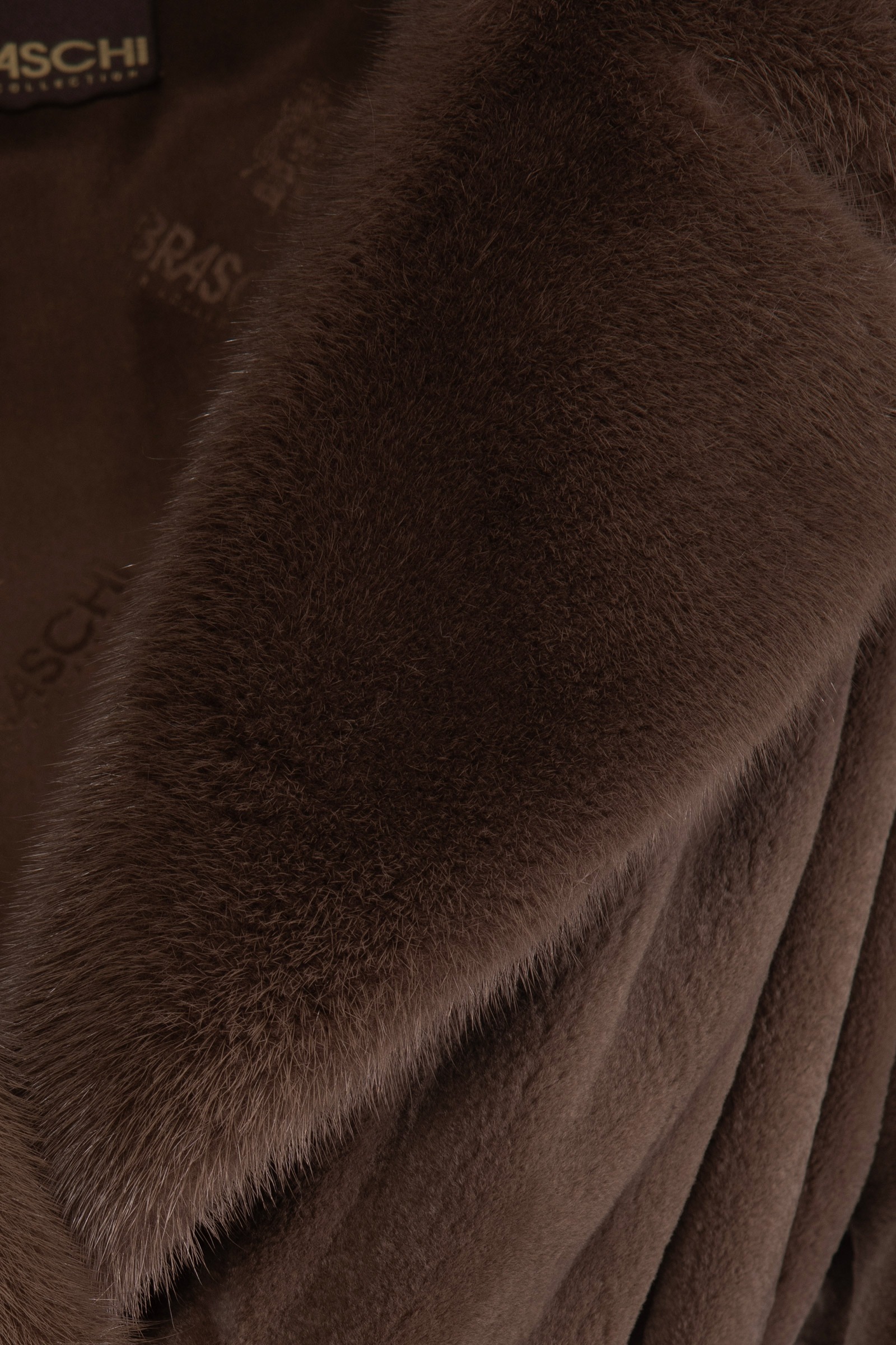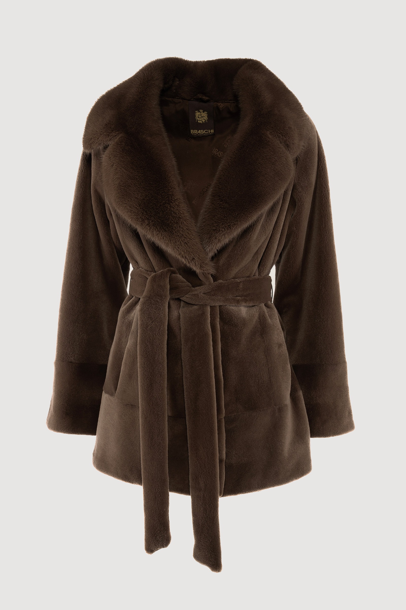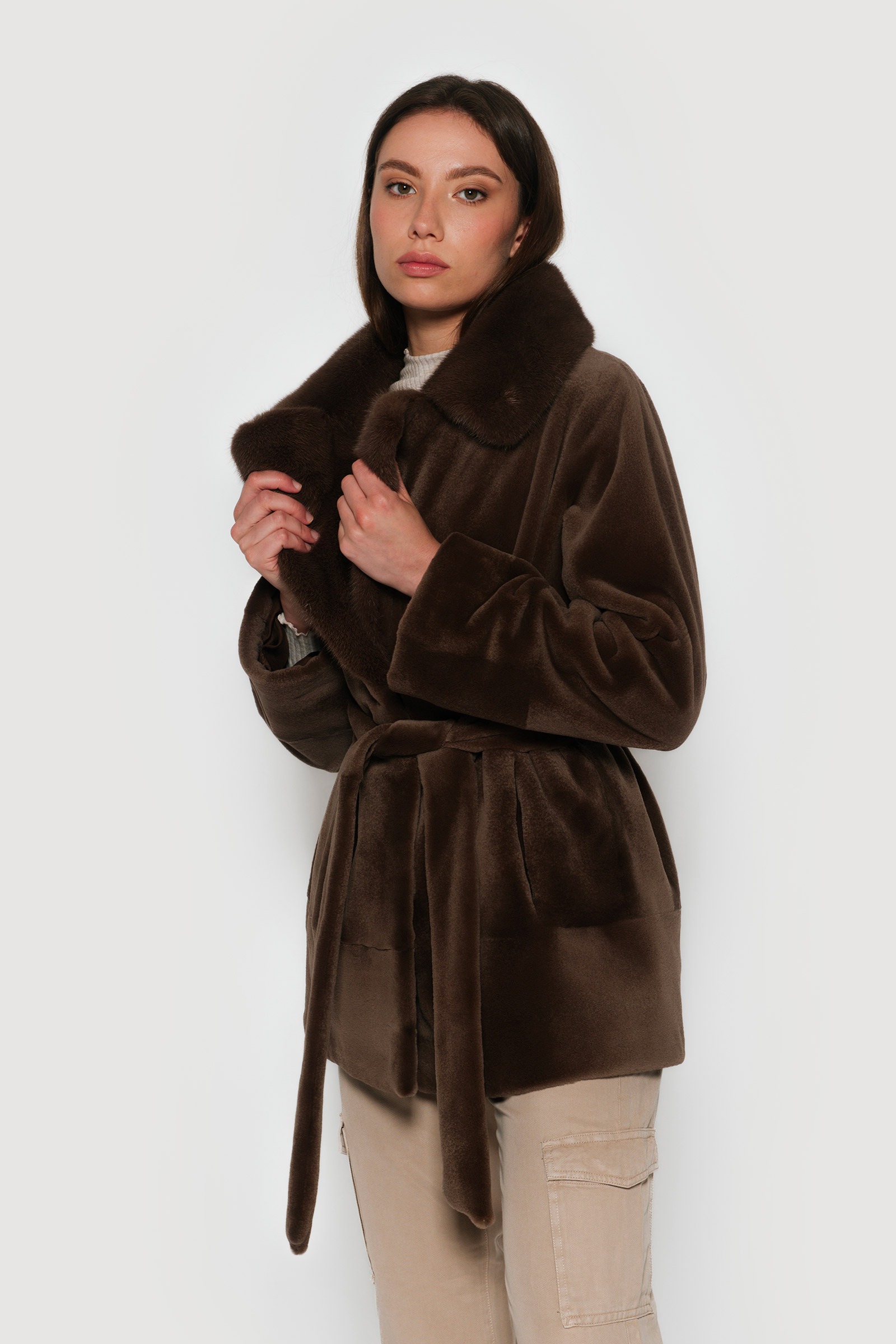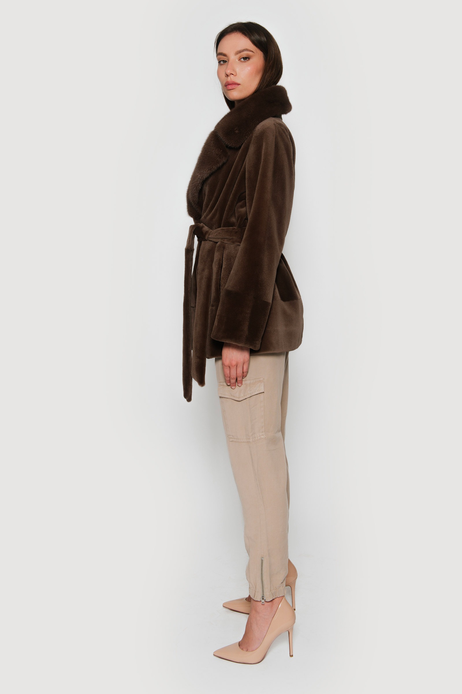 Mink jacket with vertical processing, with lapel collar, mink belt closure