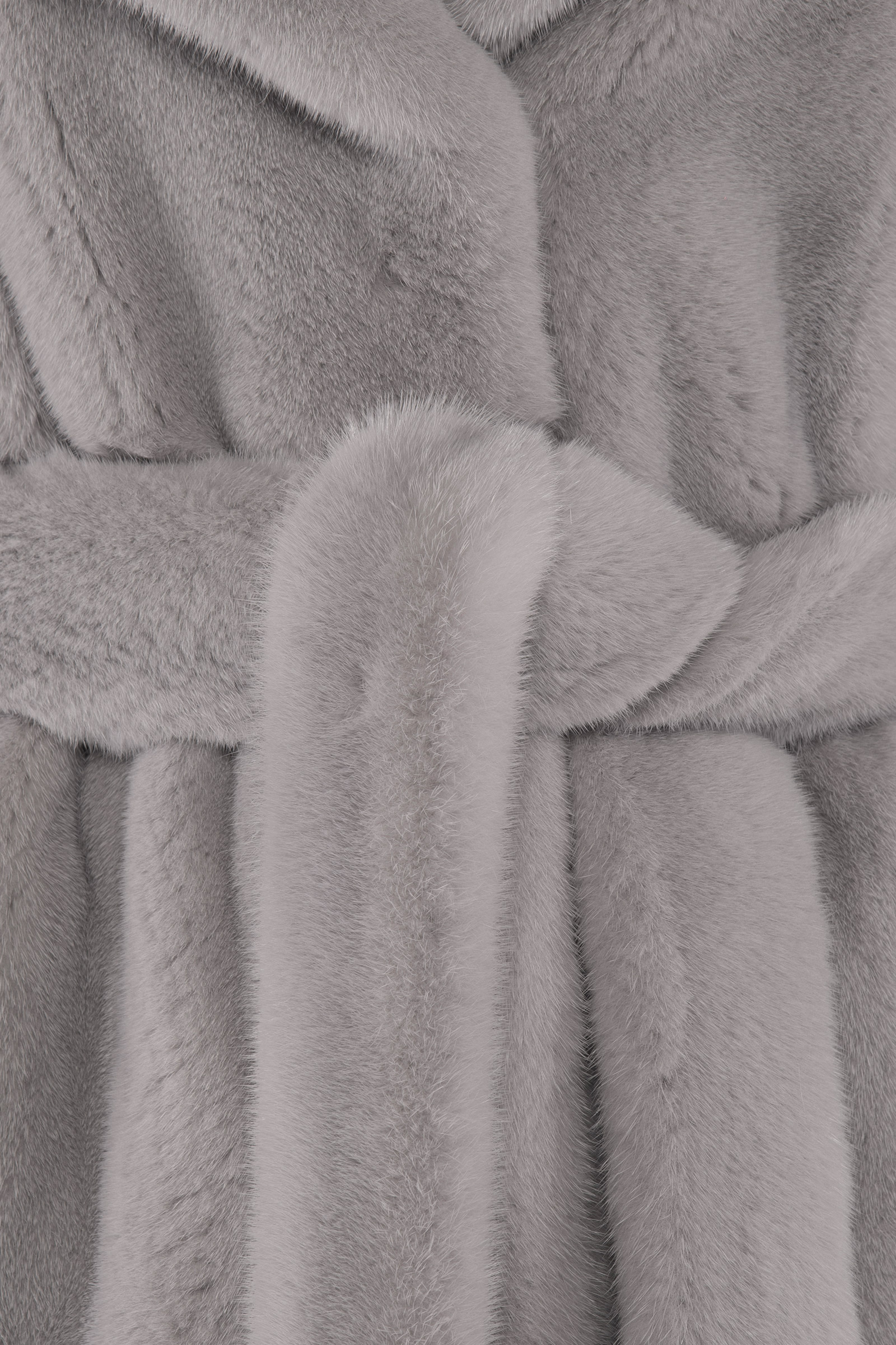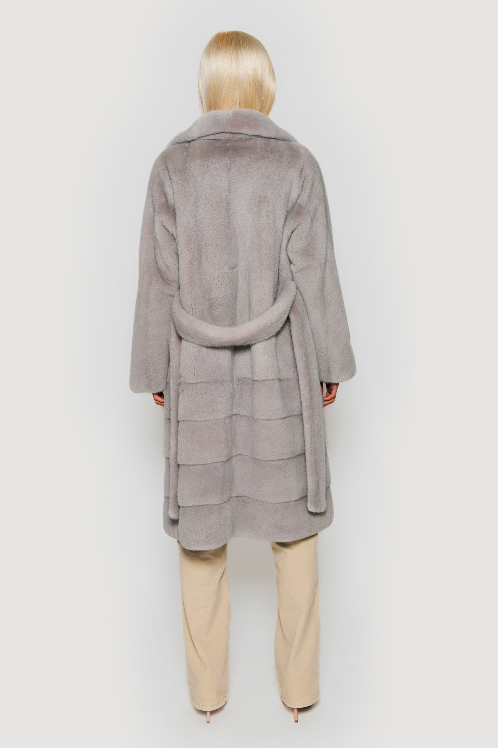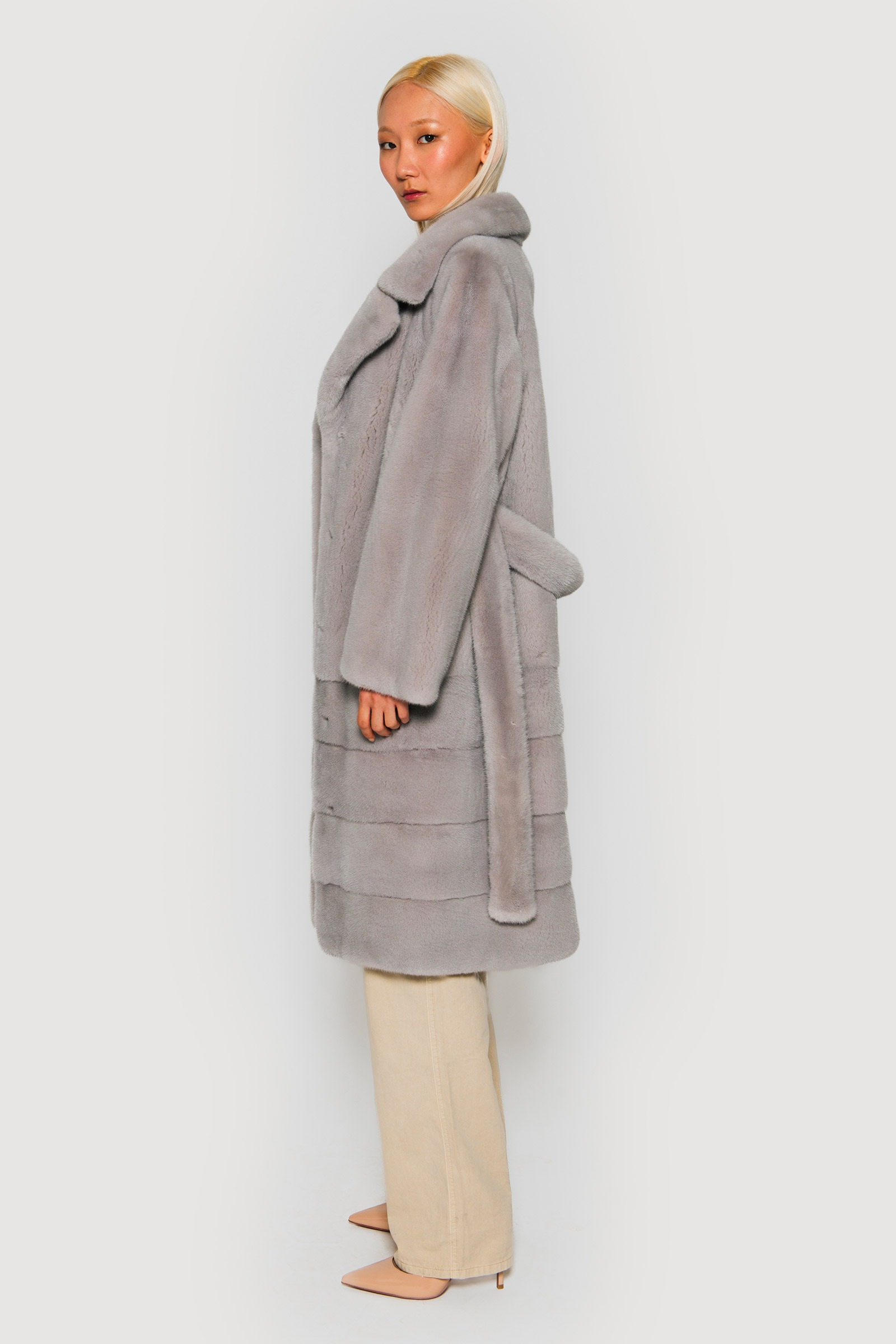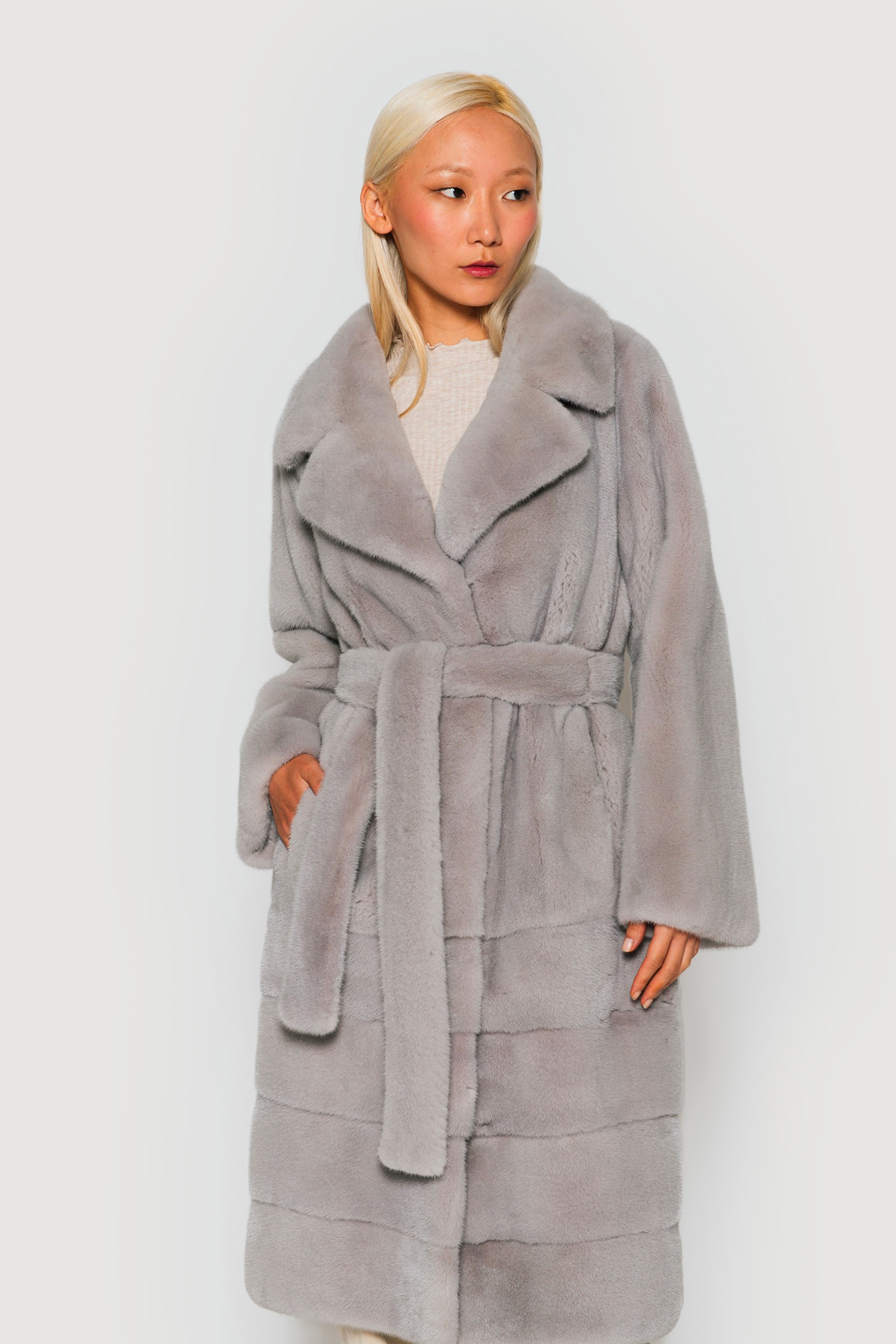 Long vertical mink jacket with lapel collar, mink belt closure, silk lining