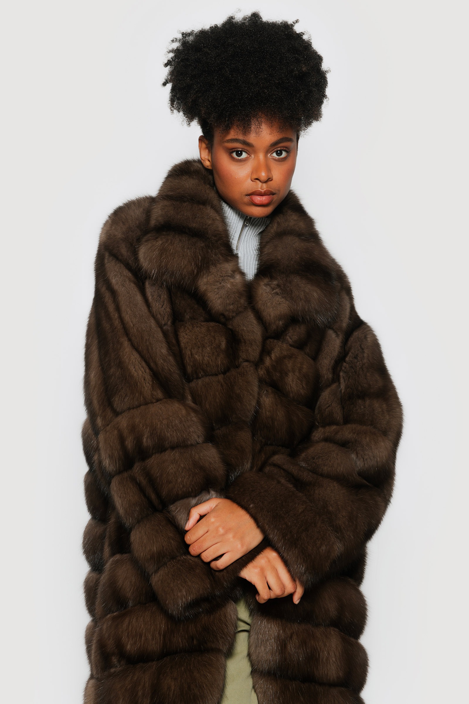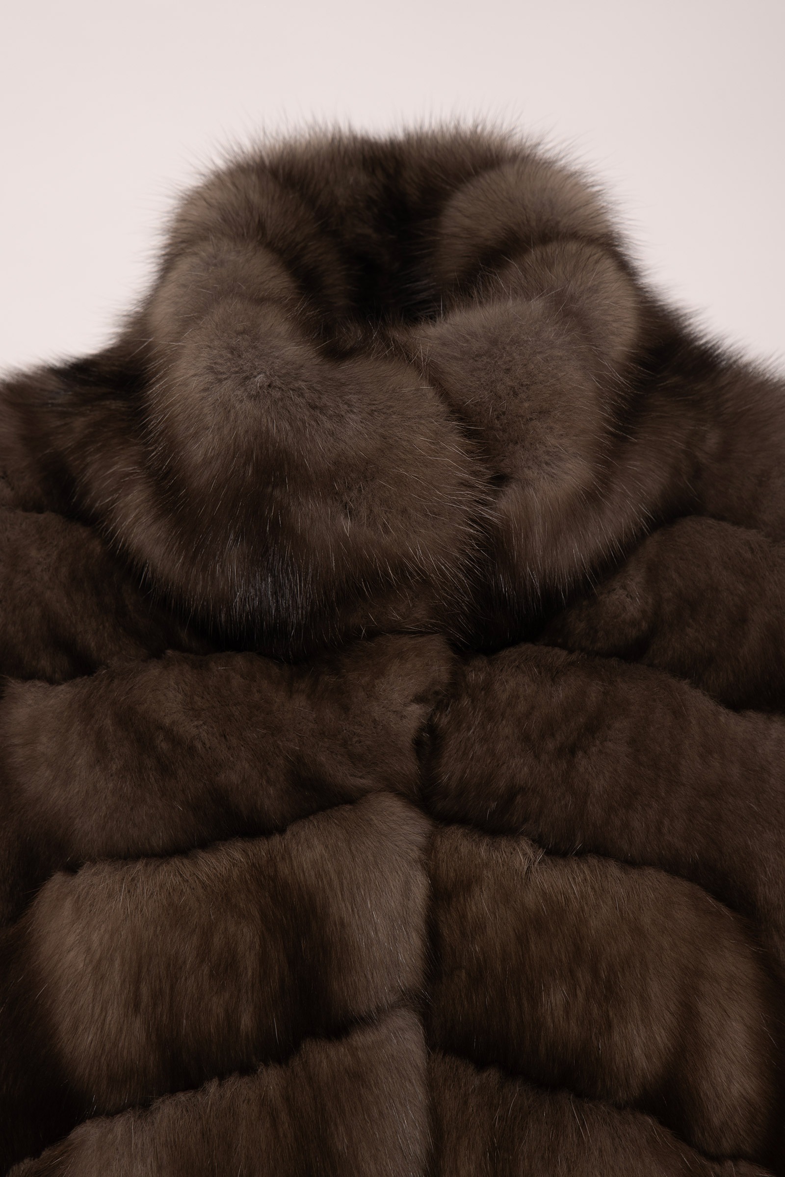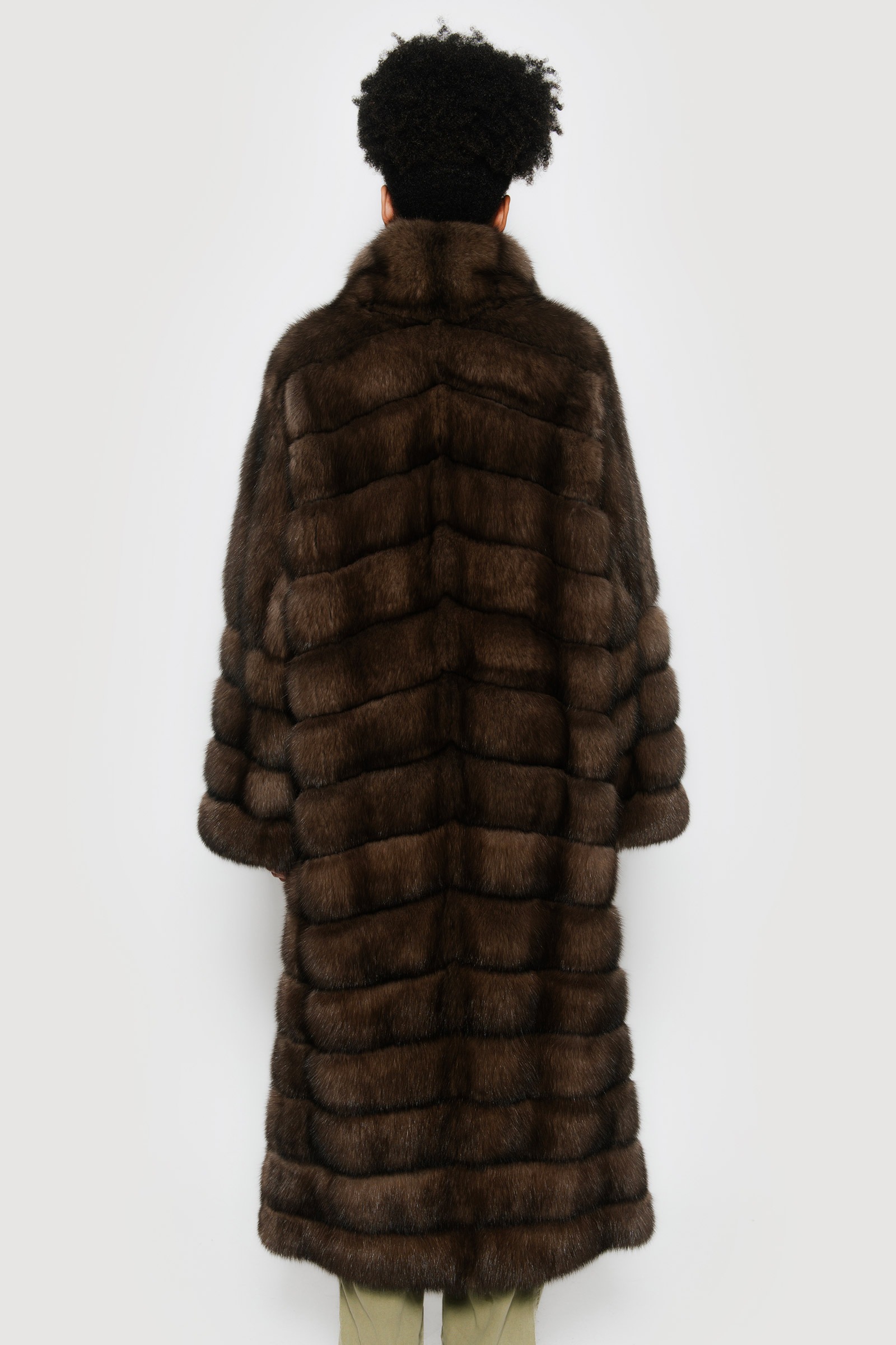 Long graphite sable jacket with shawl collar, horizontal workmanship.