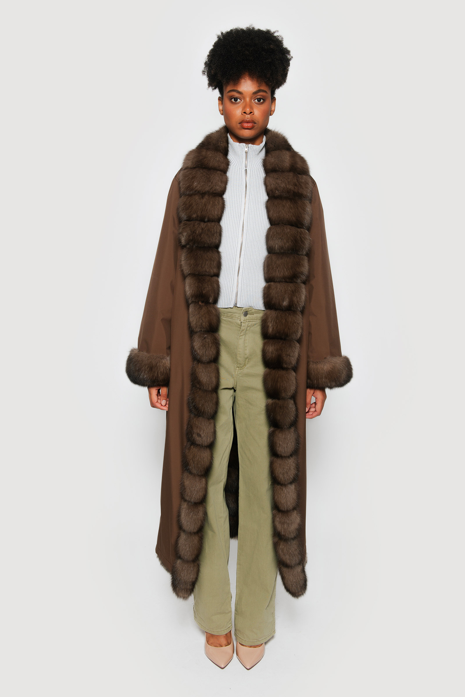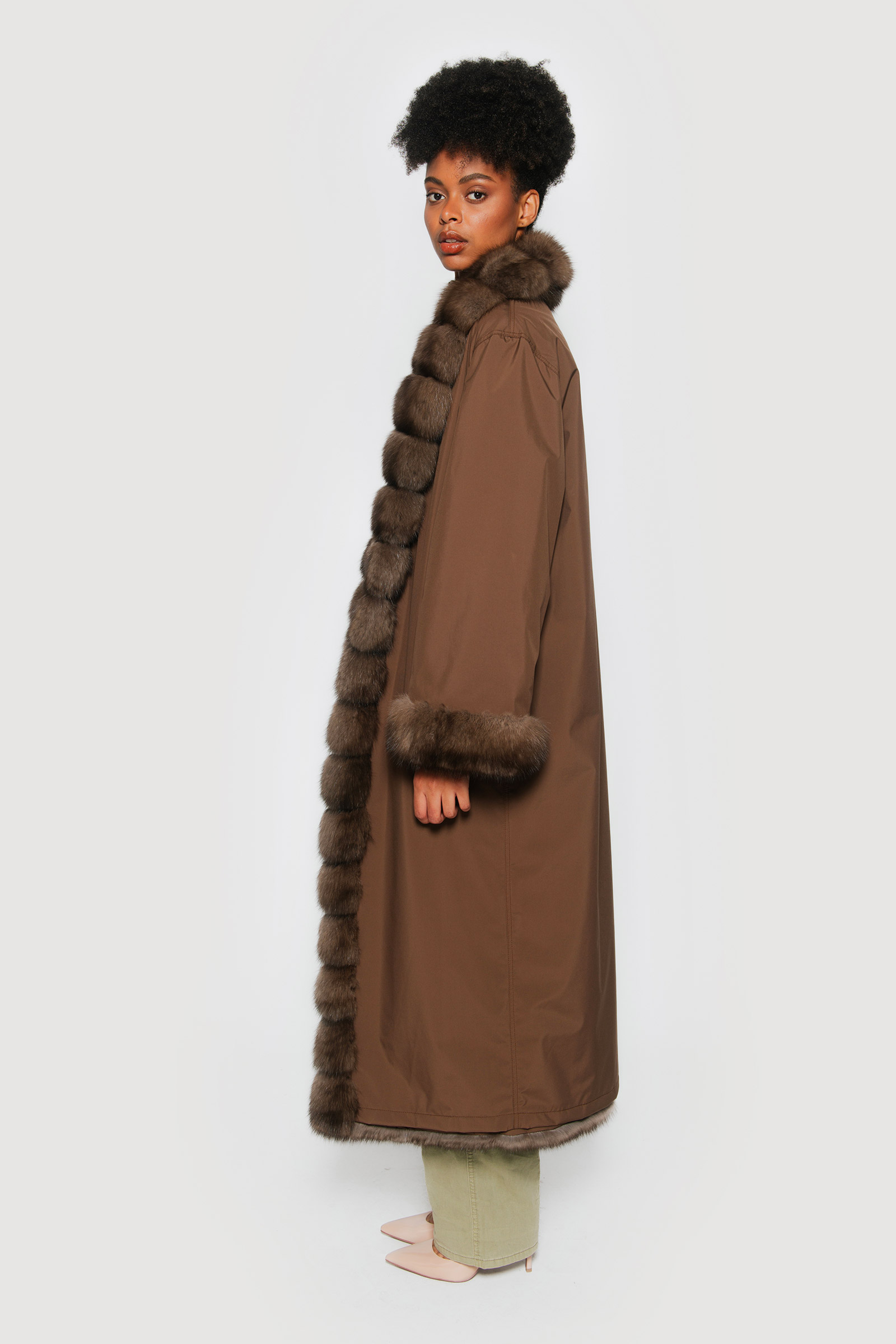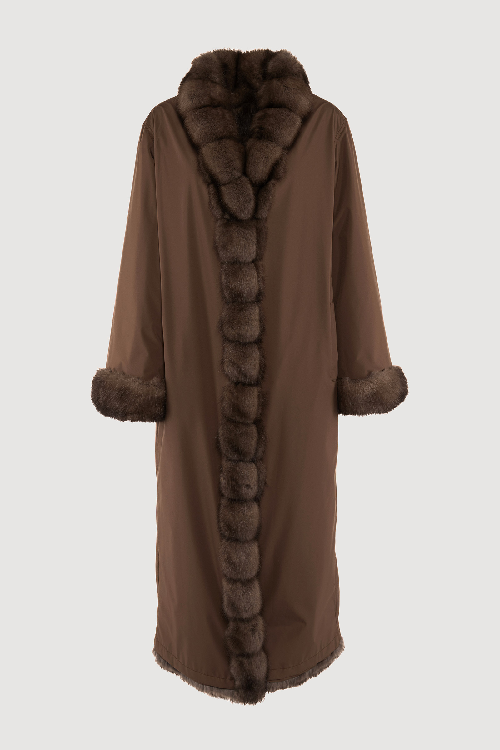 Elevate your winter wardrobe with the Long Reversible Jacket from Braschi. Crafted with luxurious graphite sable and high-tech rain system fabric, this versatile piece features a wide shawl collar. Its reversible design adds a contemporary twist, ensuring both style and practicality. Embrace Italian craftsmanship and make a statement with Braschi.