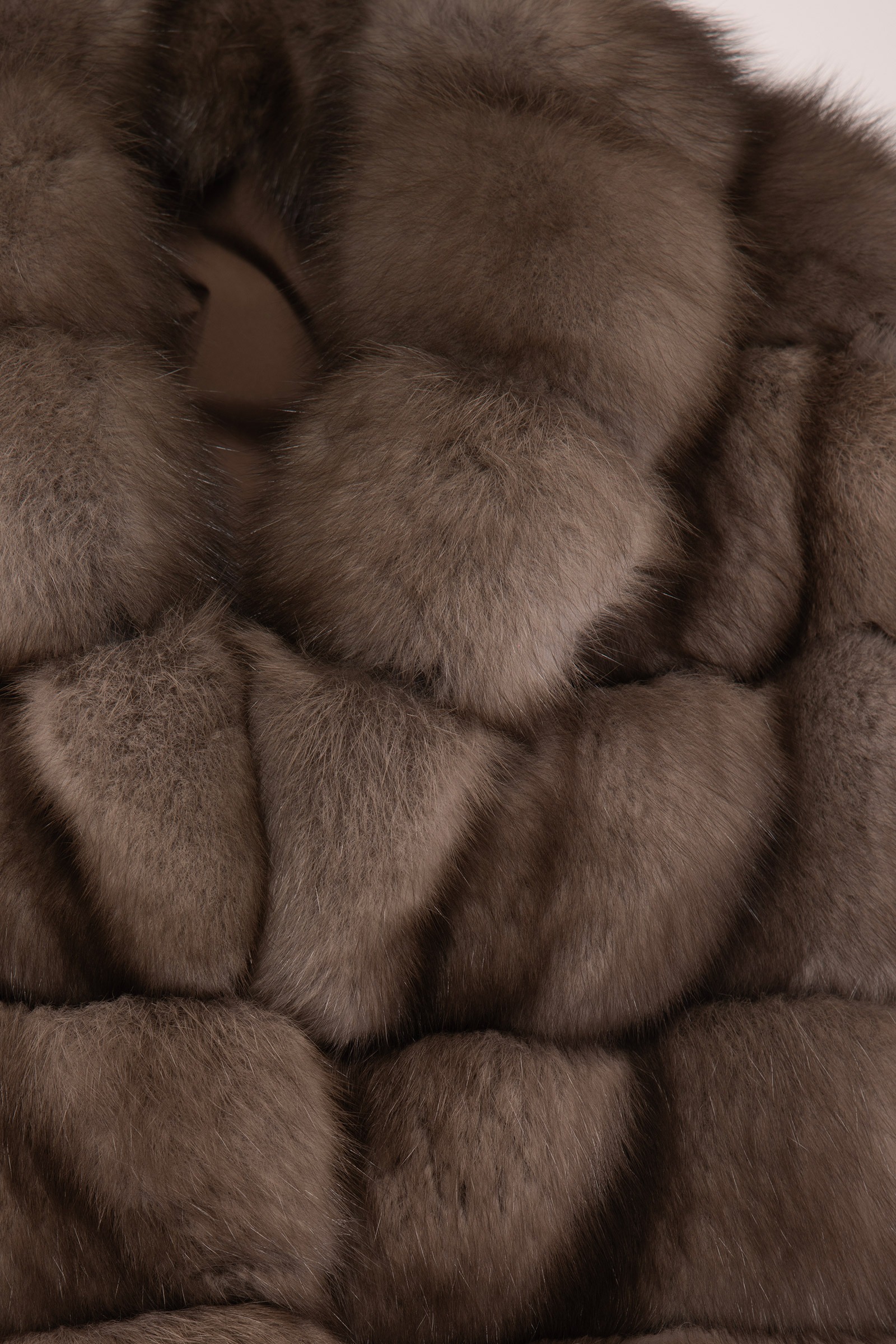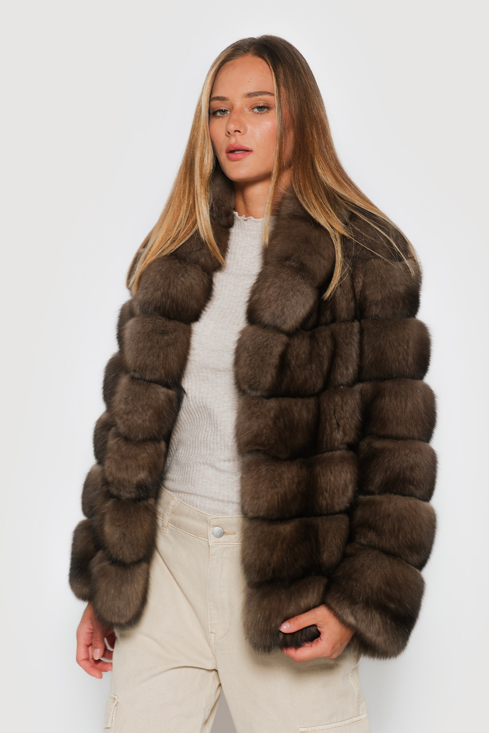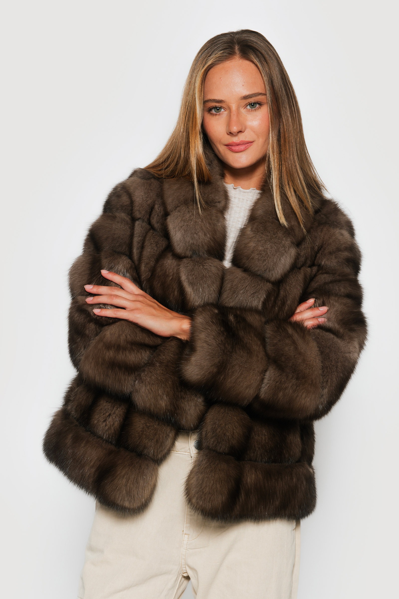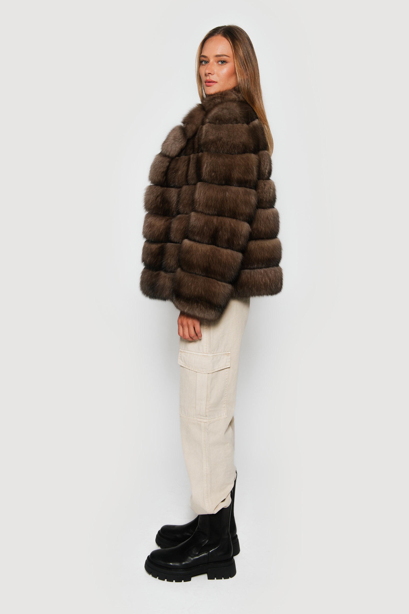 Reversible jacket in tech fabric and graphite sable in horizontal processing.