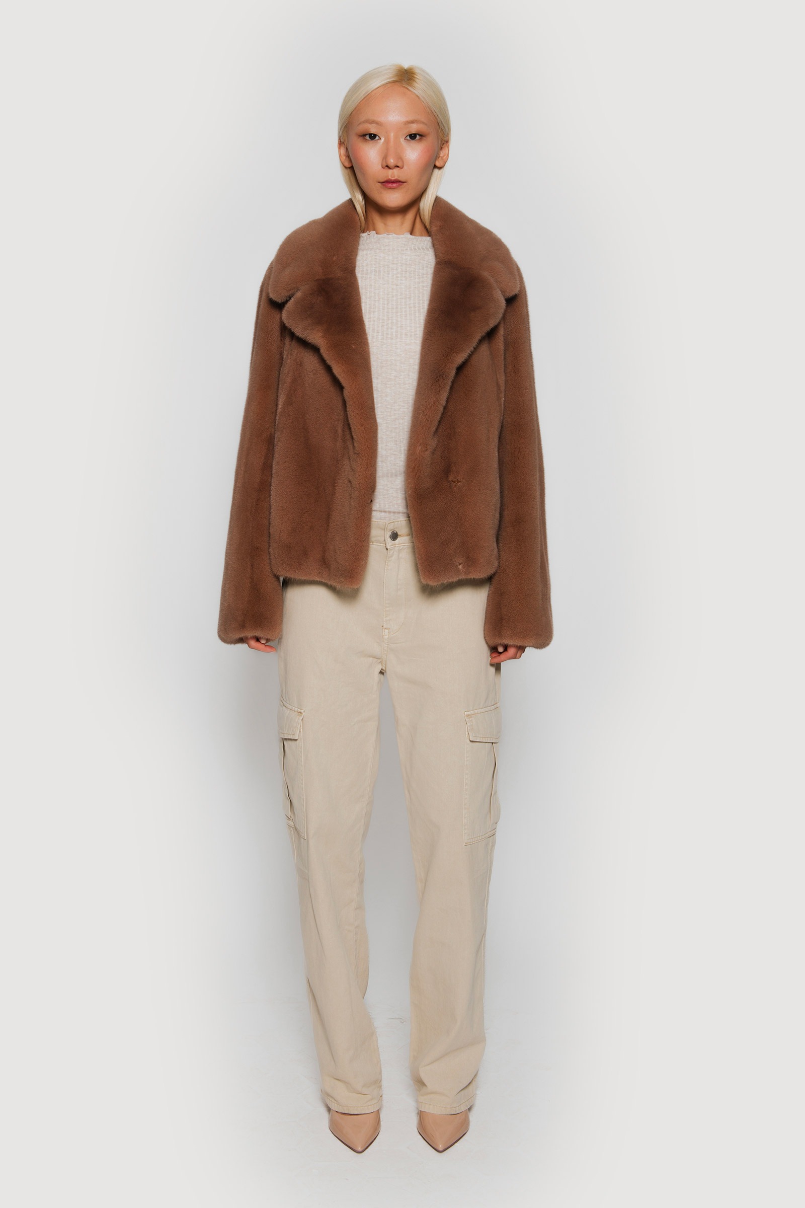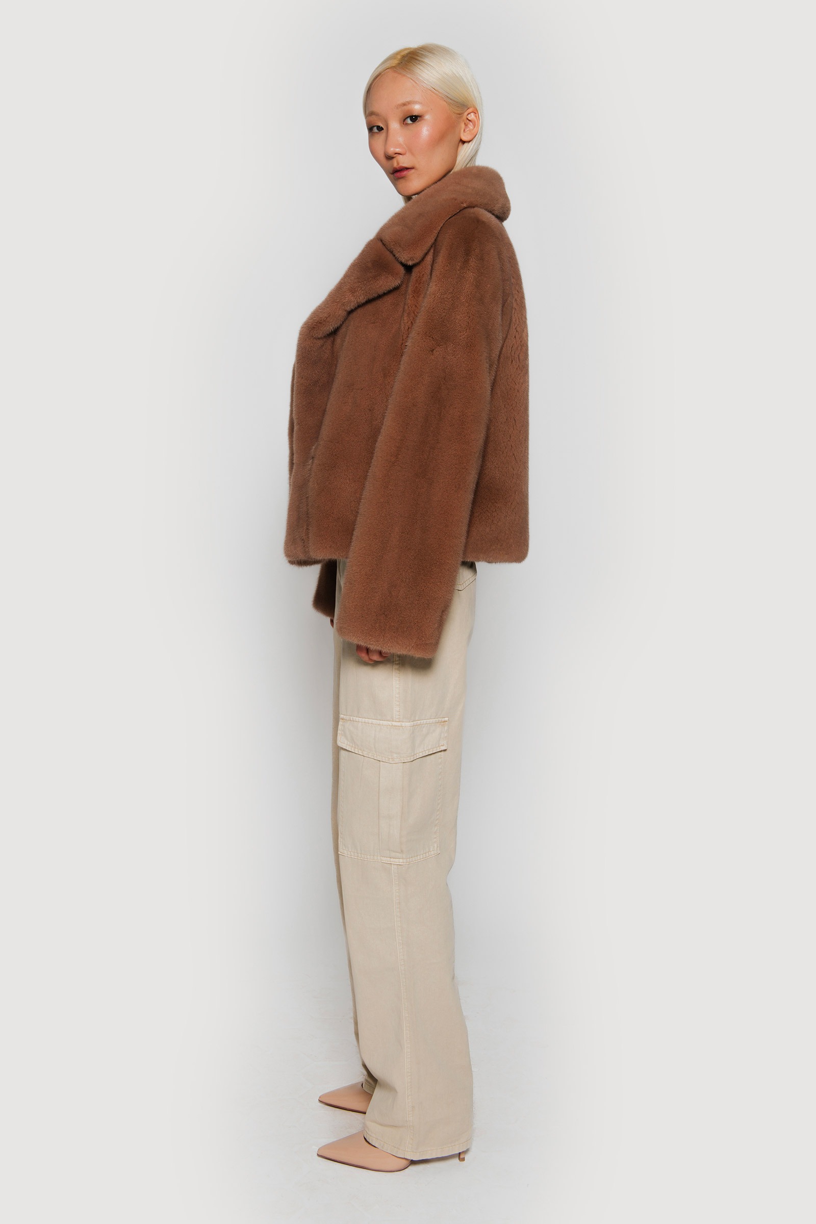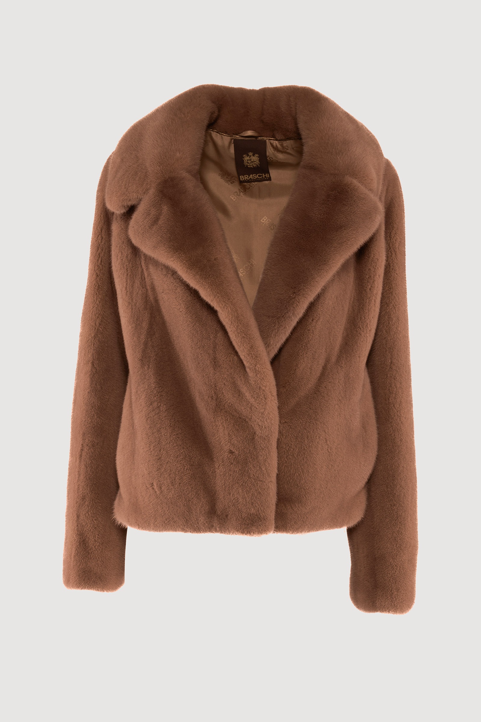 Vertical mink jacket with shawl collar, front pockets and button closure, silk lining