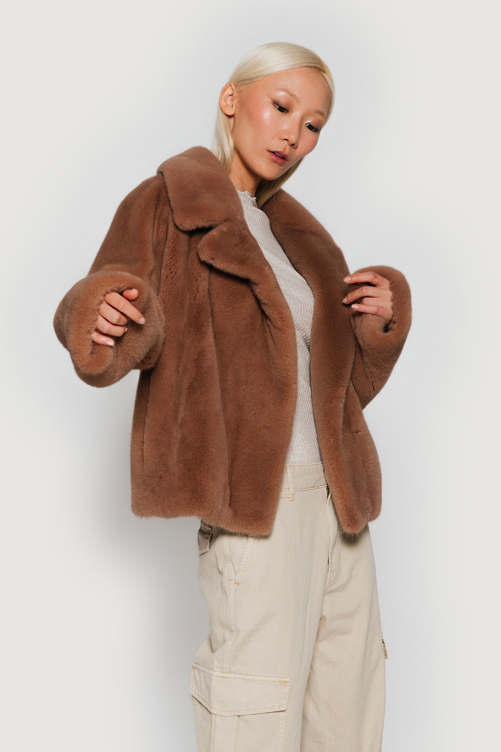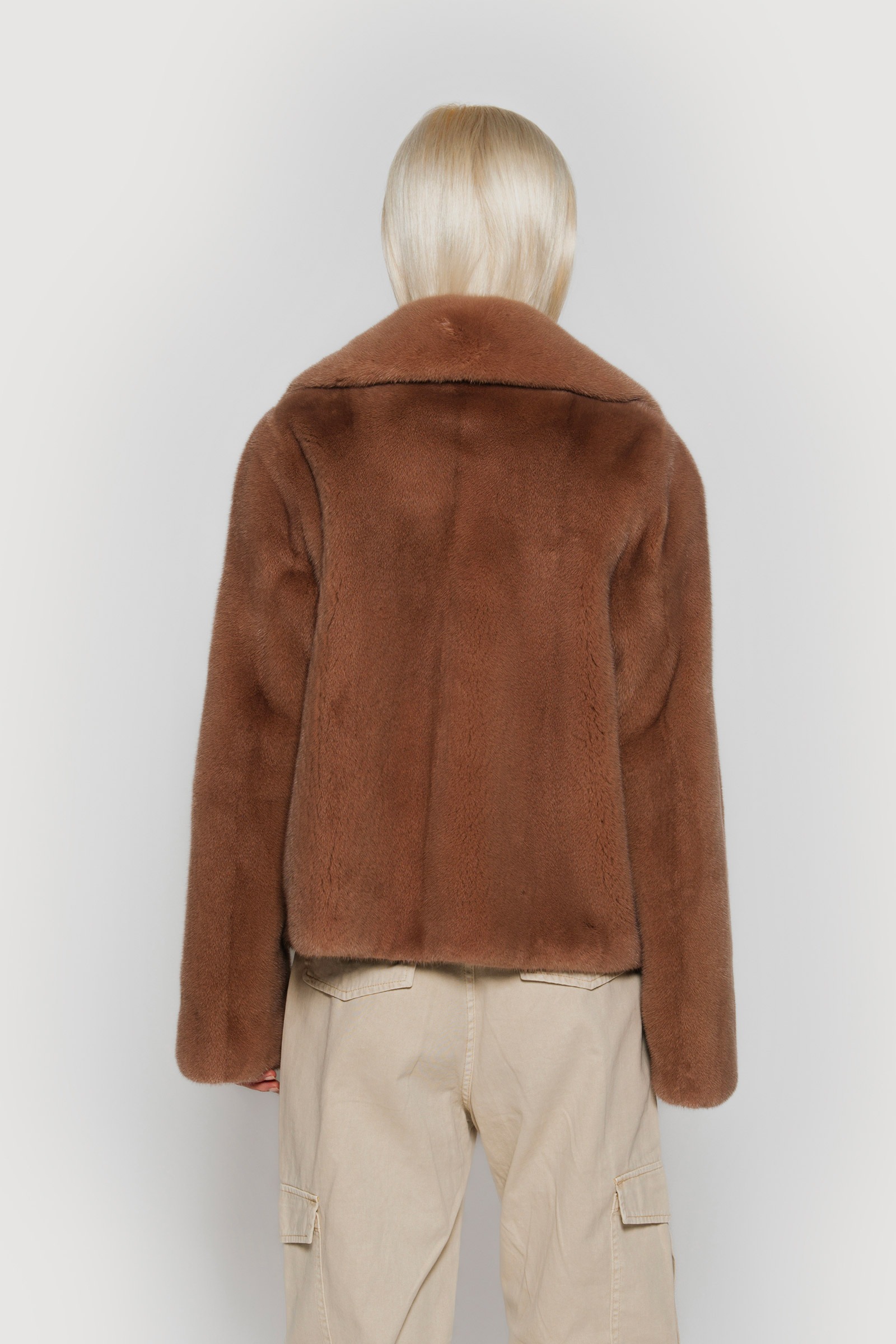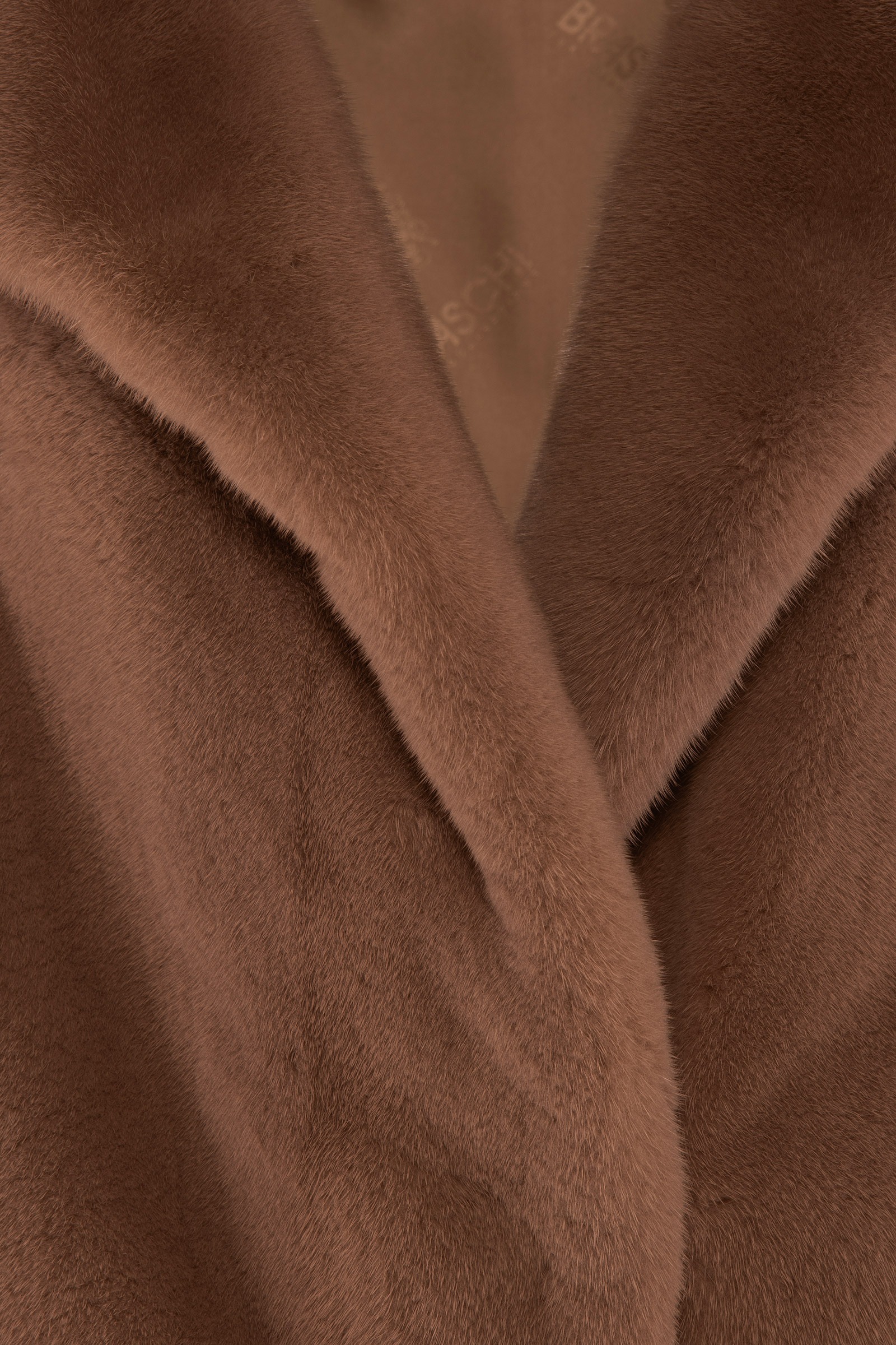 Vertical mink jacket with shawl collar, front pockets and button closure, silk lining