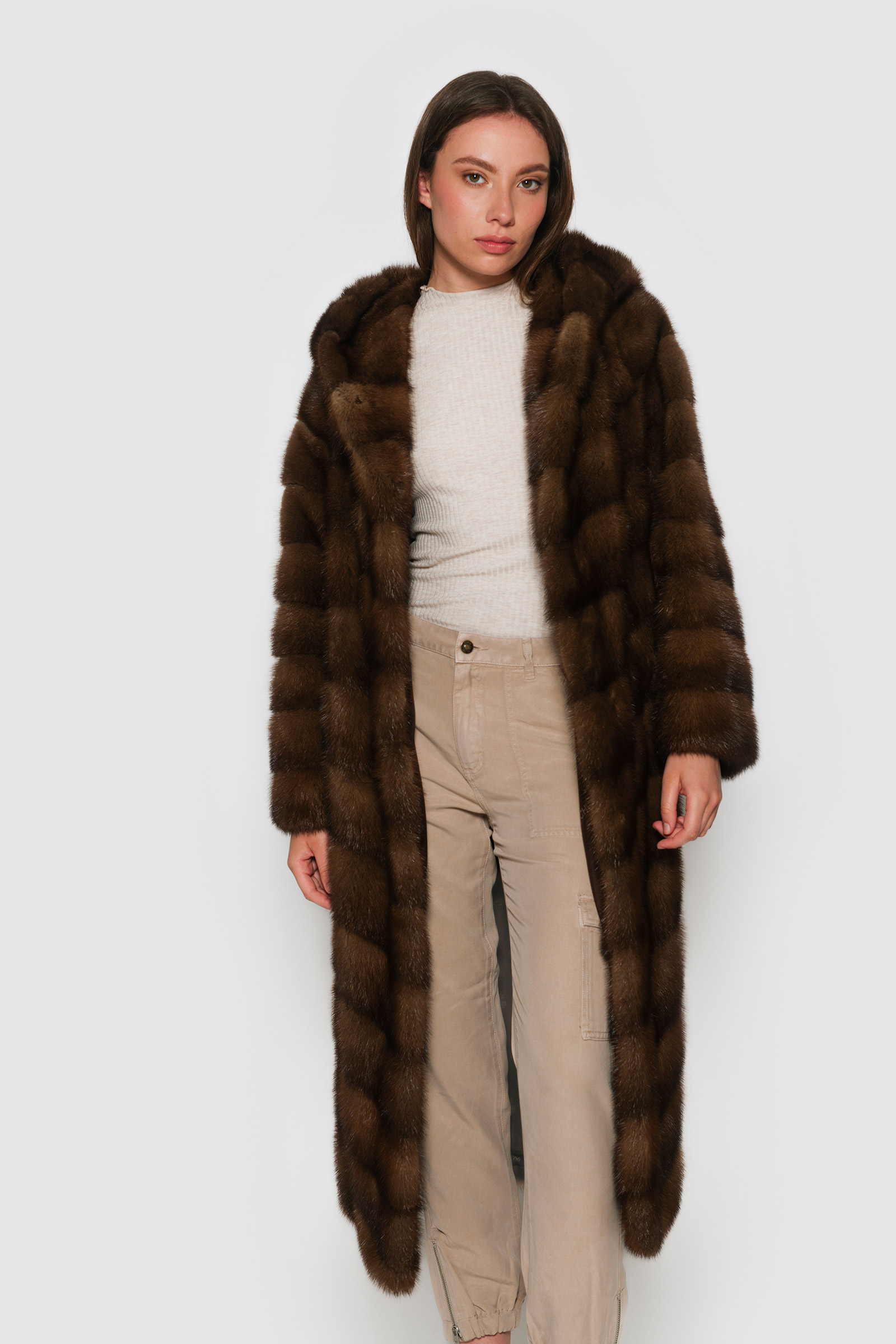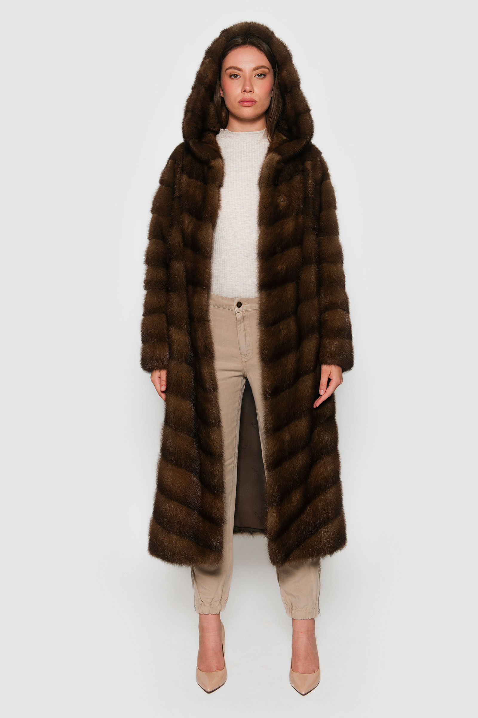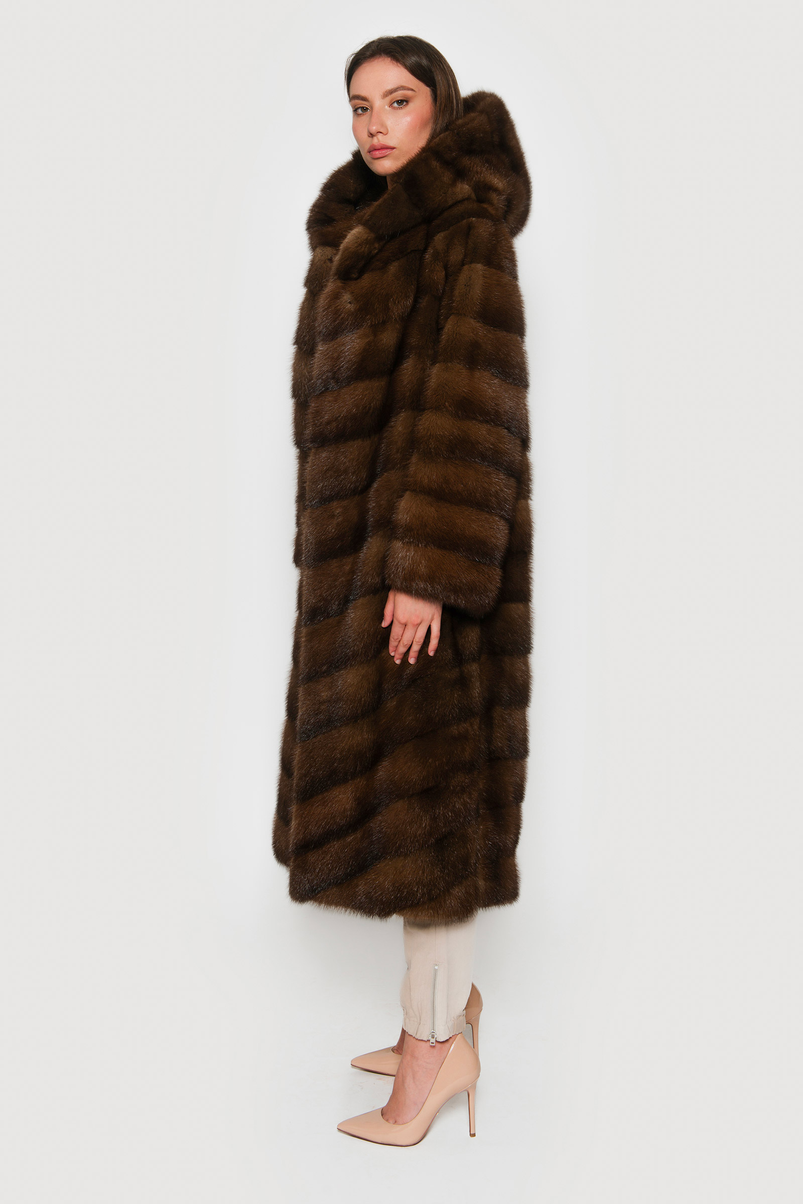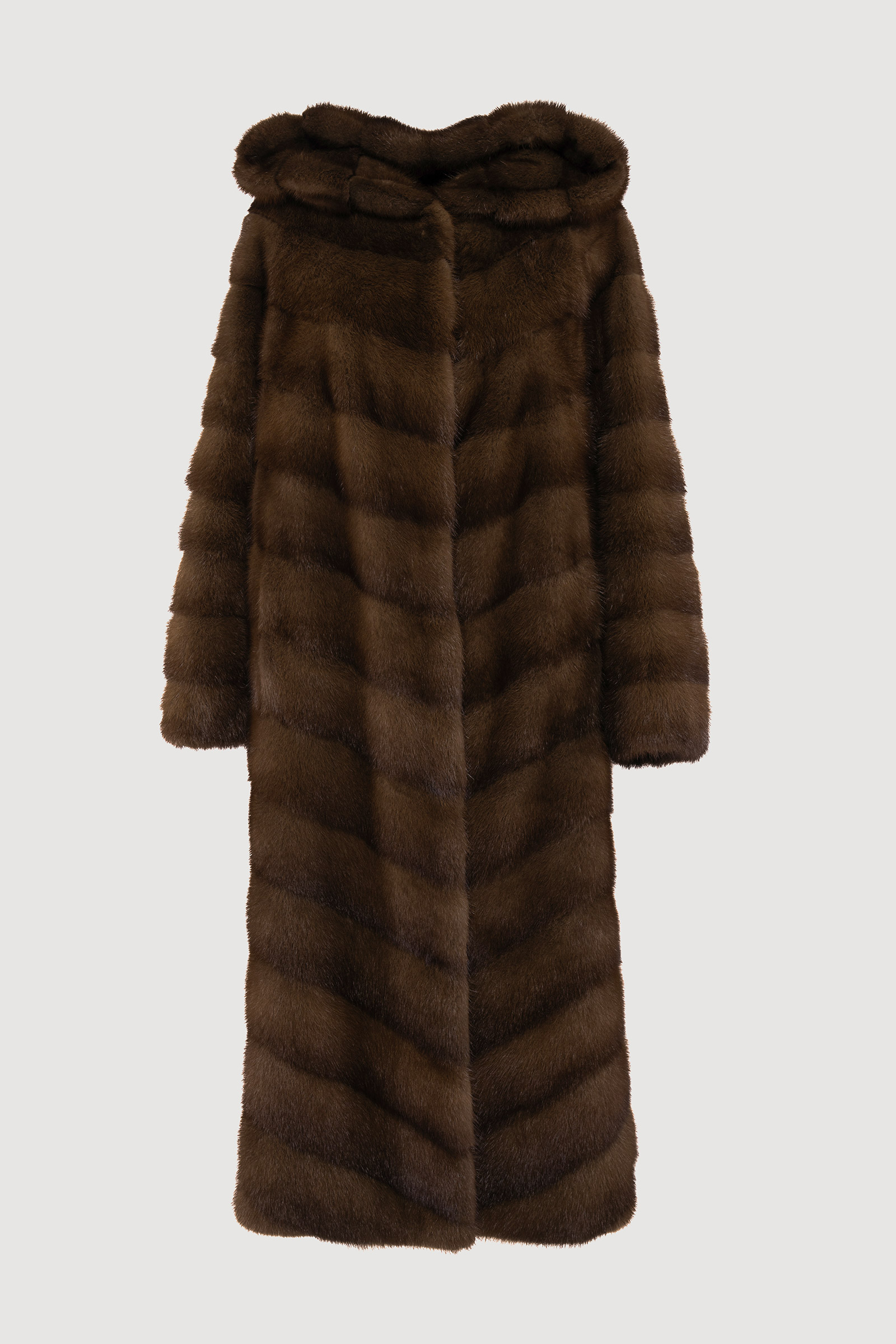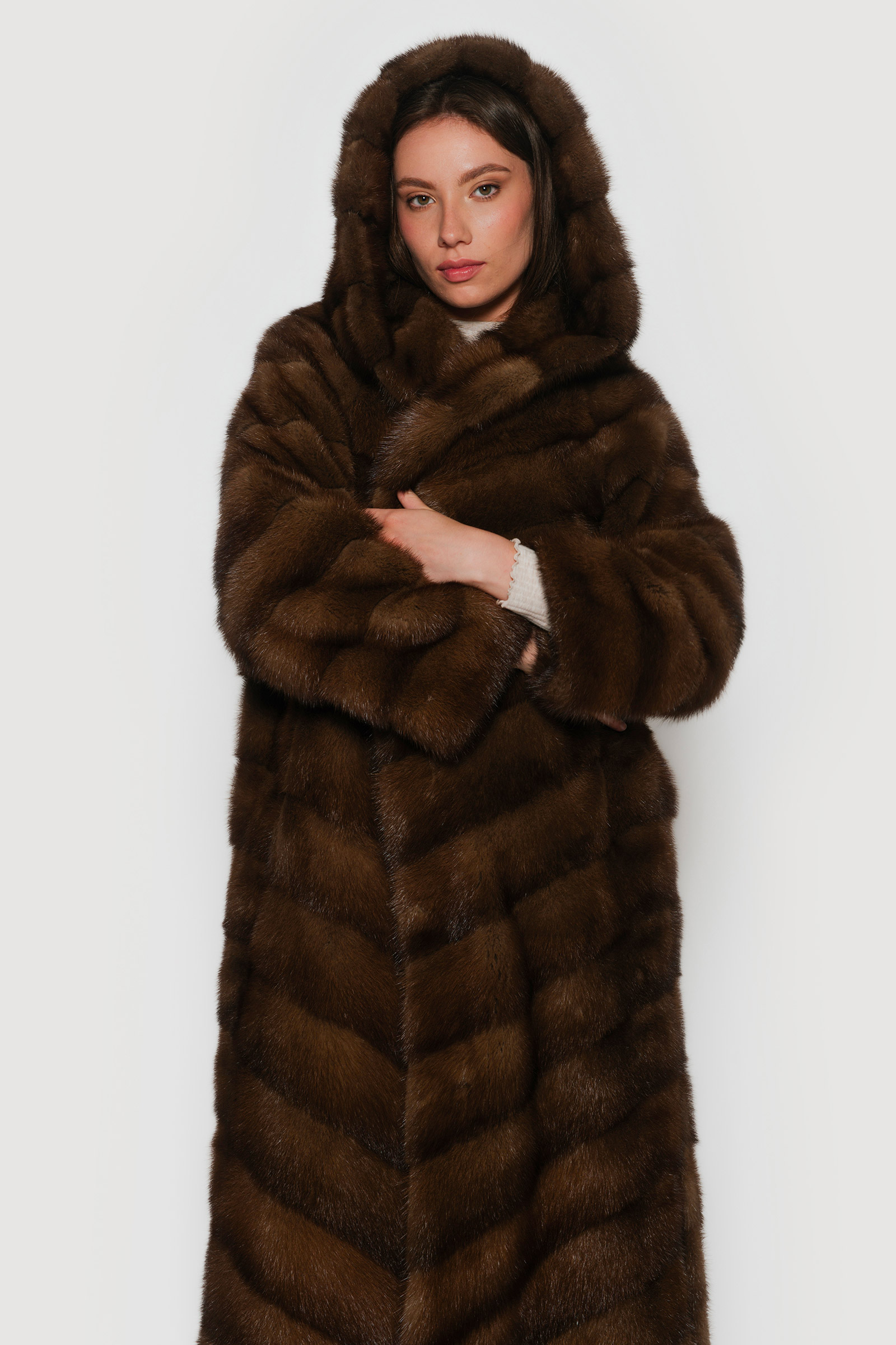 Indulge in opulent luxury with our long diagonal mink jacket from Braschi. This Italian-crafted marvel features a stylish hood and a unique diagonal pattern for a distinctive touch. The sumptuous silk lining adds unmatched comfort, making it a symbol of elegance. Elevate your wardrobe with timeless style and craftsmanship by choosing Braschi.